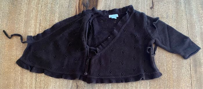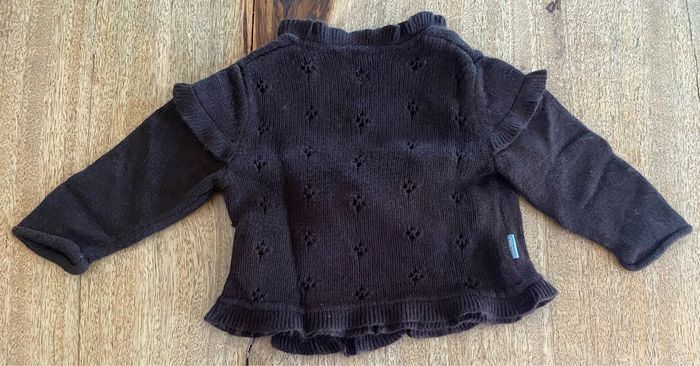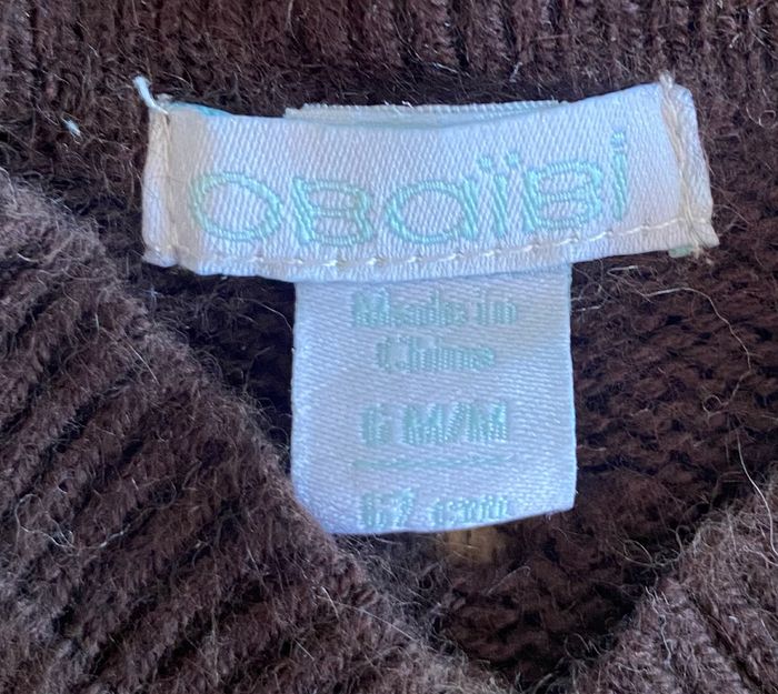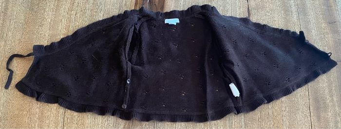 Gilet marron sans taches. Petite dentelle sur les deux manches. Ouverture du vélo de deux façons. Devant un petit lacet, à l’intérieur avec 2 petits boutons. 15 % d’angora, 35 % de coton, 28 % de nylon, 22 % de viscose.