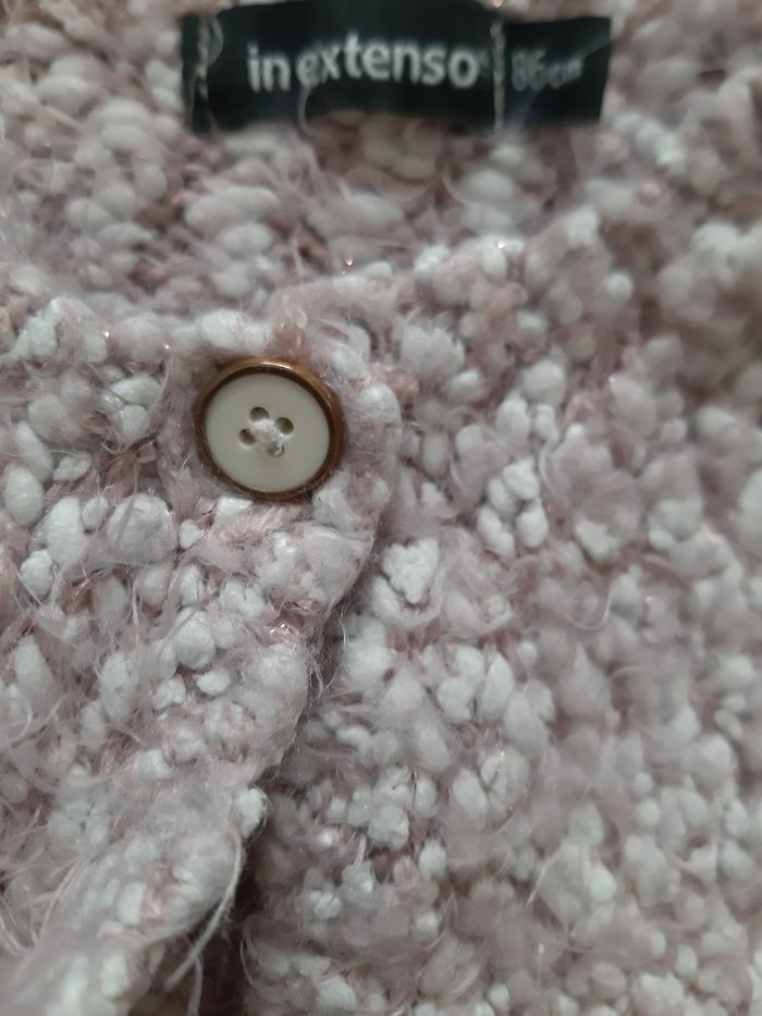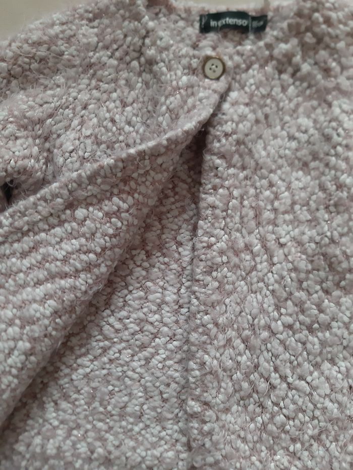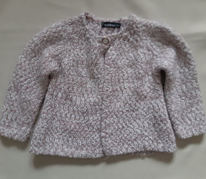 Très joli gilet chaud, de la marque in extenso, en taille 24 mois (86 cm) couleur rose chiné blanc avec effet pailleté fermeture par 1 bouton En très bon état