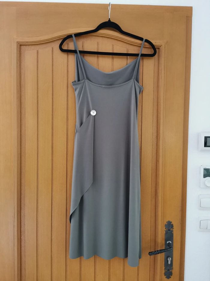 Le bouton est à l'arrière de la robe et effet drapé sur la poitrine. Très jolie rendu. Convient à un 36-38. Couleur kaki. Un côté arrivé au dessus du genou et l'autre le couvre légèrement. N'hésitez pas à faire un tour dans mon dressing pour acheter en lot 😊