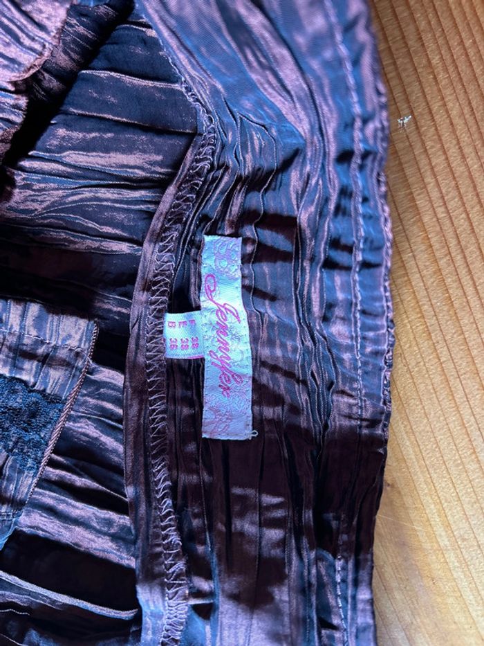 #justawinkdsvetementsfemme38 Marque : Jennyfer Taille : 38 Longueur : 69 cm Couleur chocolat brillant Voilà sur le bas de la jupe Pas de doublure Broderie en haut et en bas de la jupe