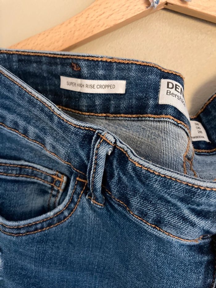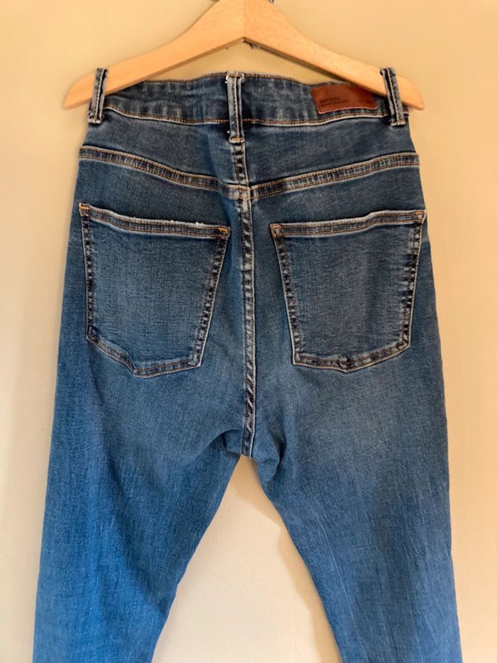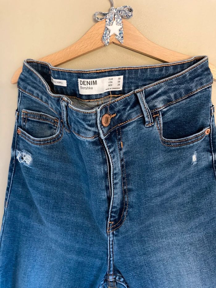 Jean Bershka 7/8ème, skinny taille haute, étiquette taille 38 mais taille petit. Légères déchirures d’origine et bas frangé. Très bon état. N’hésitez pas à visiter mon dressing #vanini78femme36 🛍👚🛍. Réductions activées dès 2 articles. Uniquement sur les lots
