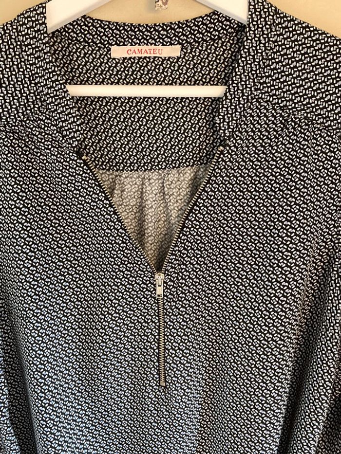 Robe courte, manches 3/4, fond noir, motifs blanc et bleu/gris, fermeture pour porter avec décolleté ou sans et ceinture, Camaïeu taille 36. Très bon état. N’hésitez pas à visiter mon dressing #vanini78femme36 🛍👚🛍. Réductions activées dès 2 articles. Uniquement sur les lots