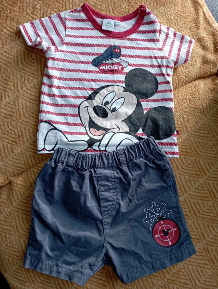 Ensemble bébé Mickey en bon état Tee shirt et short ,il ya un bob qui va avec mais qui a décoloré si vous ne le voulez pas avec il suffit de me le préciser.