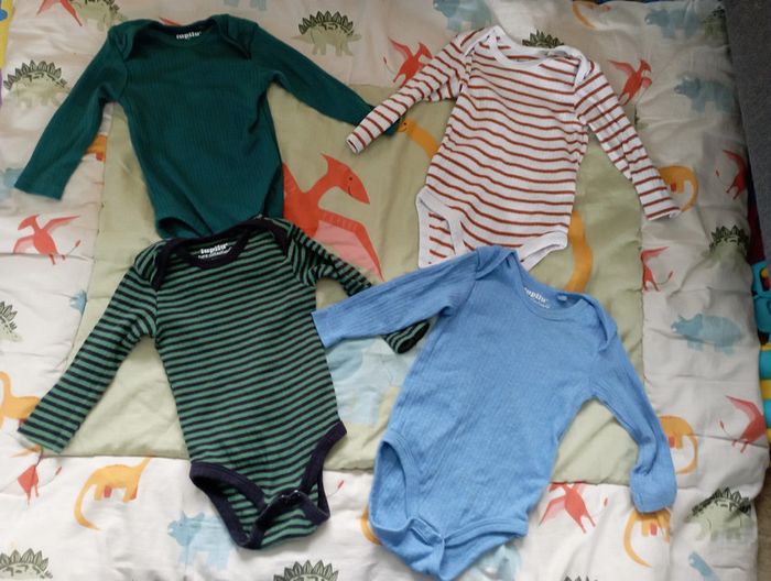 Lot de quatre bodies neuf juste lavé.Taille 2-6 mois (62/68 cm).Marque Lupilu.