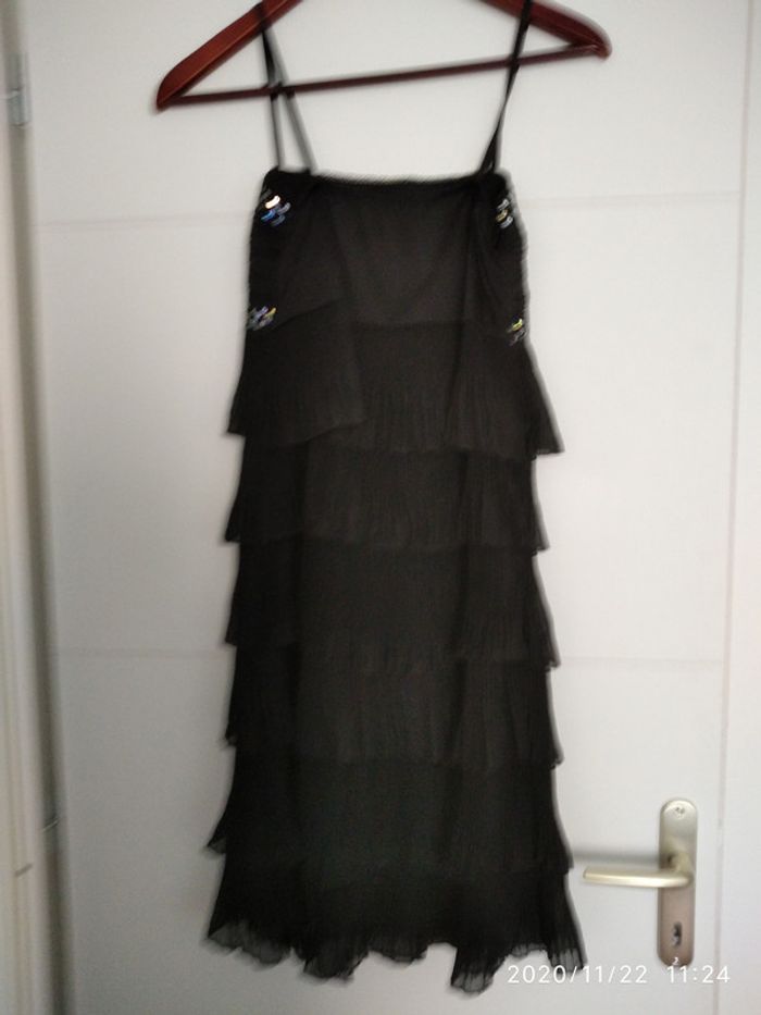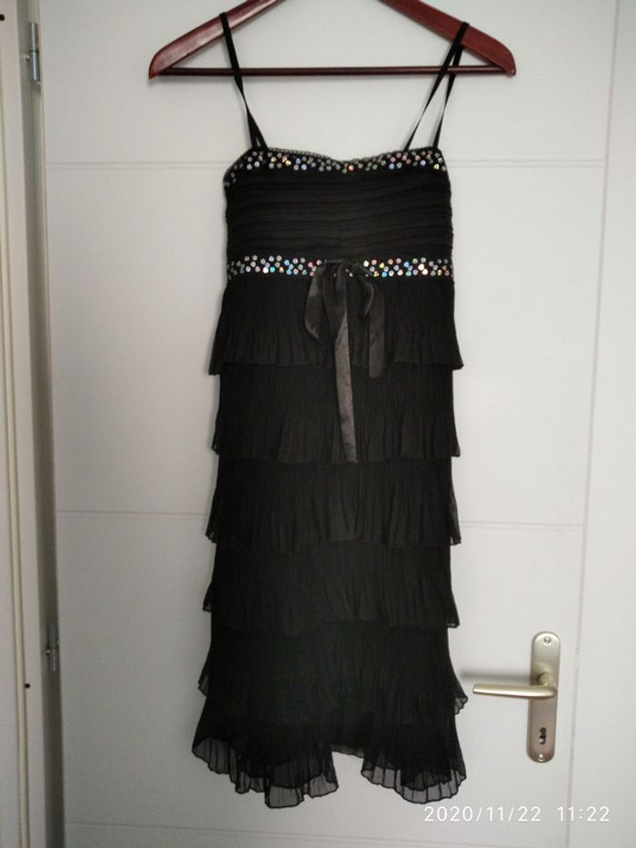 Robe de soirée à volant avec strass et ruban cousu au niveau de la poitrine . Bretelles non réglable.Taille unique mais convient plus pour un 38/40