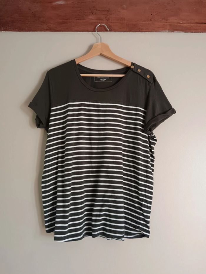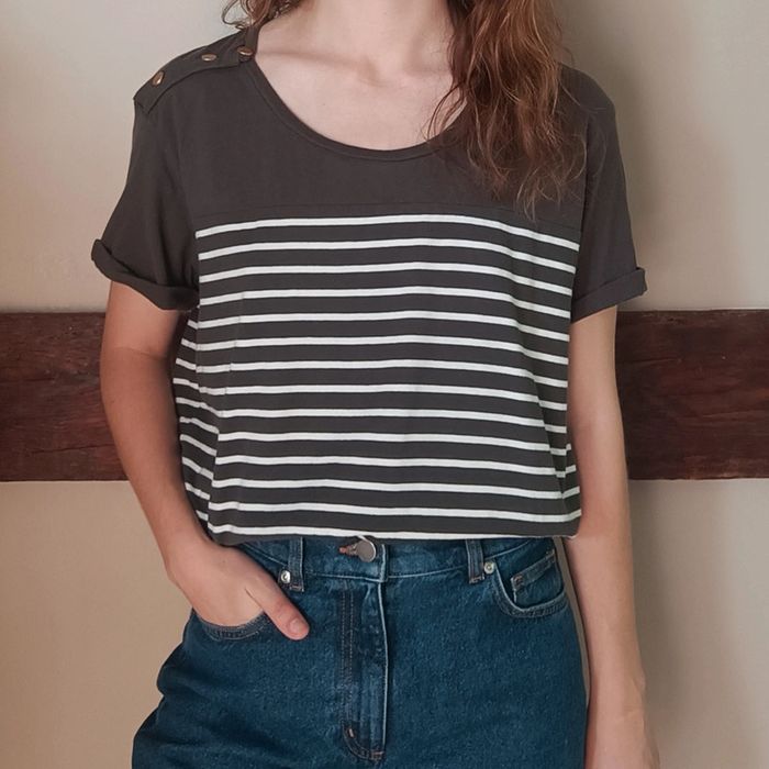 💐 Réductions sur les lots 💐 2 articles : -5% 3 & 4 articles : -10% 5 articles et plus : -15% ⚠️ Pas d'envoi Vinted go, merci Étant une entreprise déclarée payant des charges, merci de respecter mon travail en ne le bradant pas 🙏 ✨ T-shirt marinière kaki vert foncé rayé blanc à boutons dorés épaule gauche Monoprix Autre Ton 100% coton Très bon état Taille 4 soit une taille 42 Je le porte sur un 36 sur les photos et mesure 1m61 📏 Dimensions à plat : carrure 42cm, largeur poitrine 55cm, longueur 67cm #desibellesfripes42