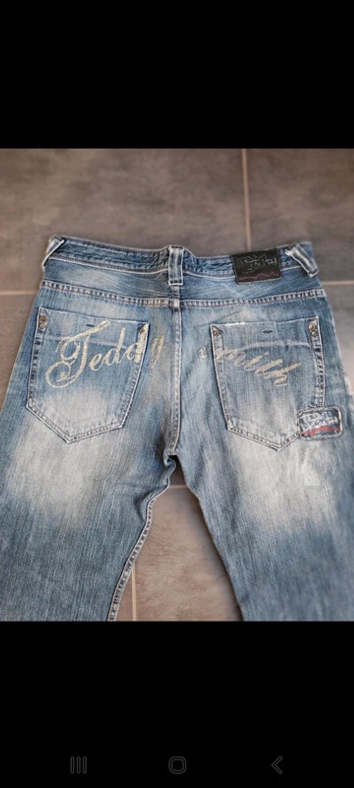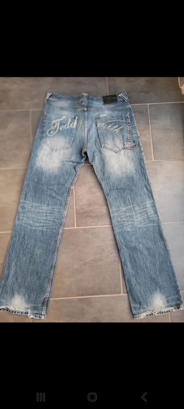 Jean Destructuré teddy smith Inscription à l'arrière sur les fesses Délavé Troué sur 1 genou En excellent état W 32, L 34 #philmarihommel #philmarihommem