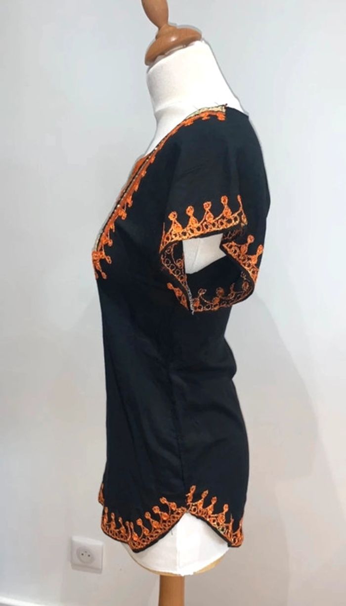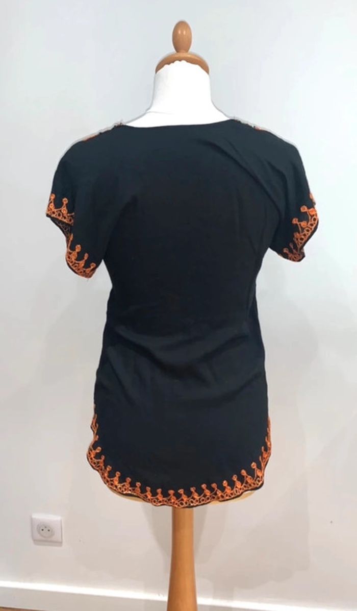T-shirt tunique noir col en V avec broderies orange et doré Taille S Excellent état porté 1 fois