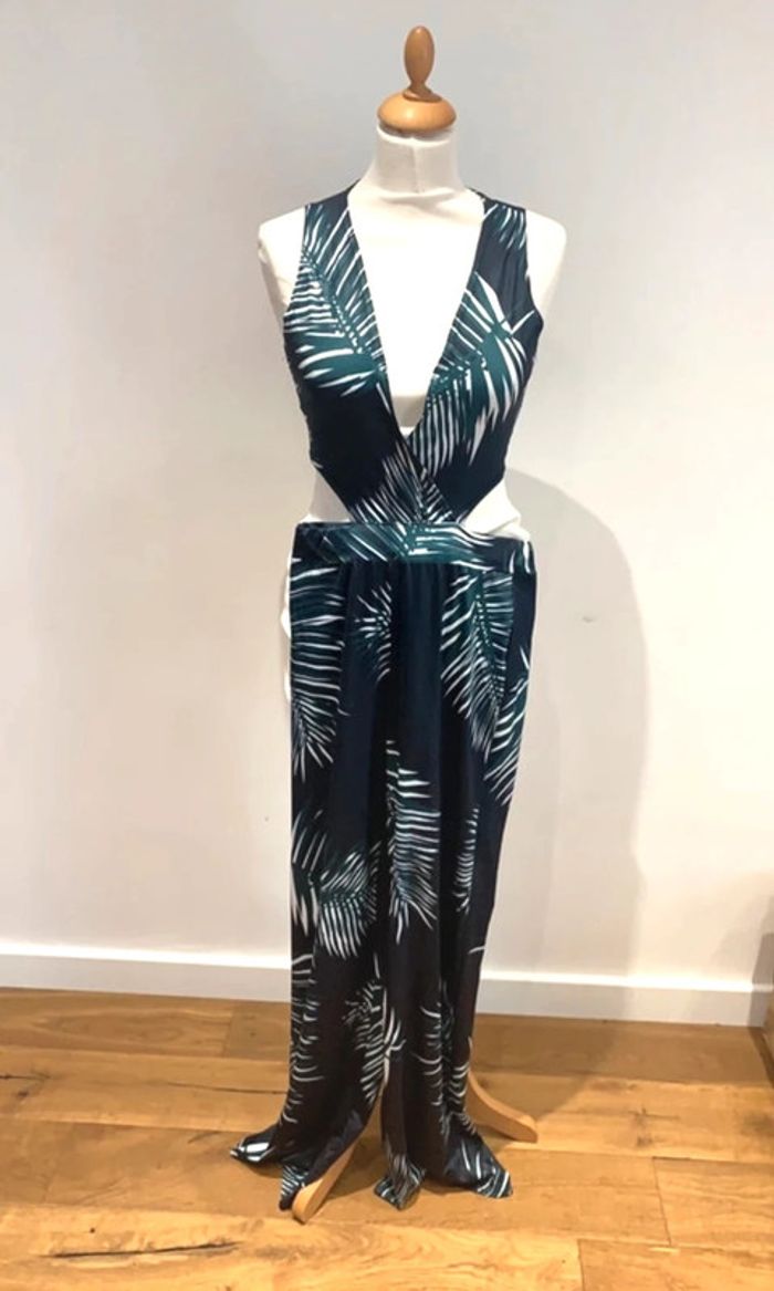 Combinaison légère décolleté plongeant taille demi ouverte motifs bleu marine et vert motifs exotiques Taille S mais équivalente à un 36-38 matière élastique Neuve jamais portée