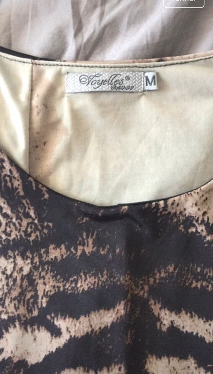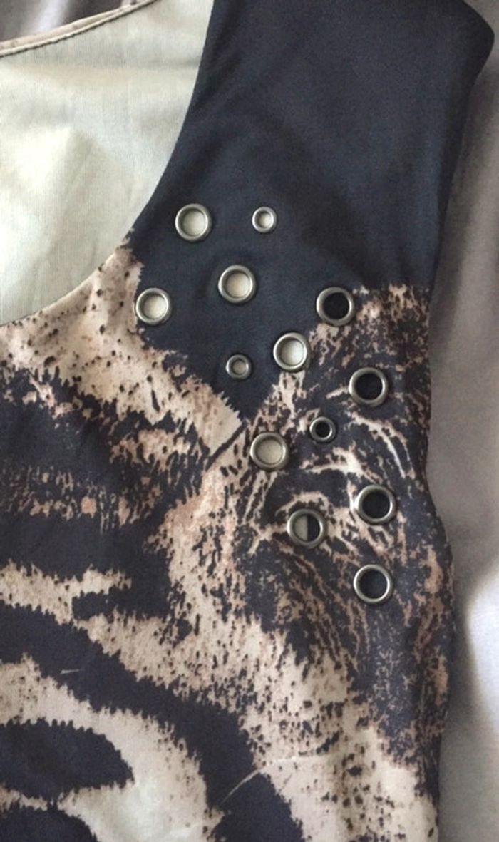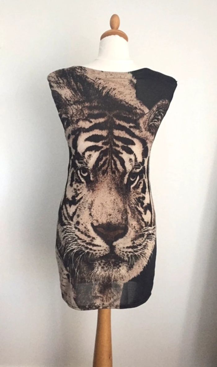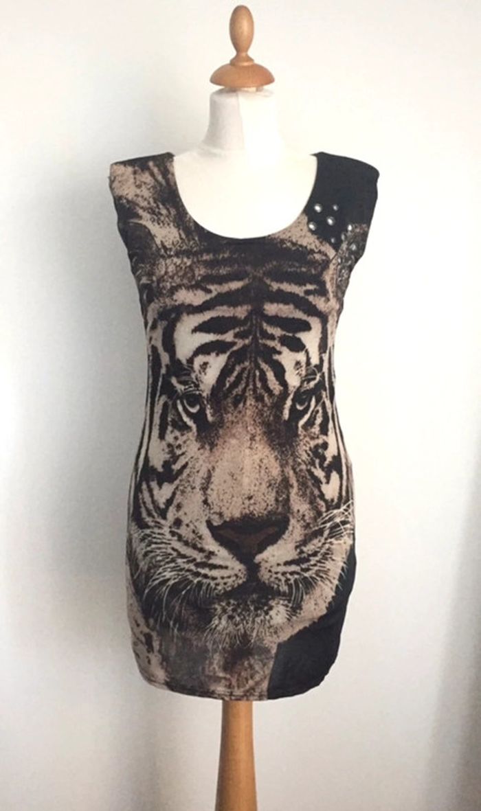 Robe noire mini moulante matière extensible imprimé tigre Taille 36 Excellent état portée 1 fois