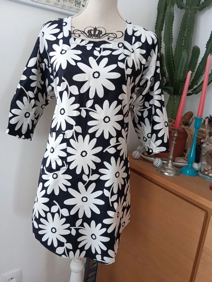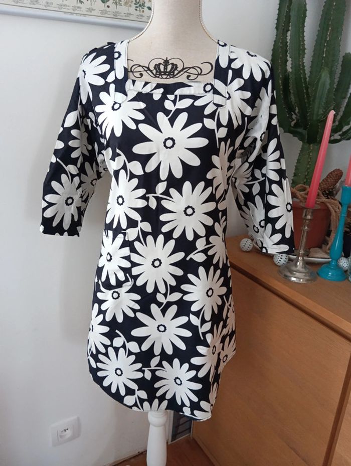 Blouse noire longue à fleurs blanches taille 38 Encolure carrée, Manches 3/4 Joli dos, Nouettes au dos Taille 38/40 estimée à confirmer avec les Mesures Epaules 45cm Aisselles 49cm Longueur 90cm