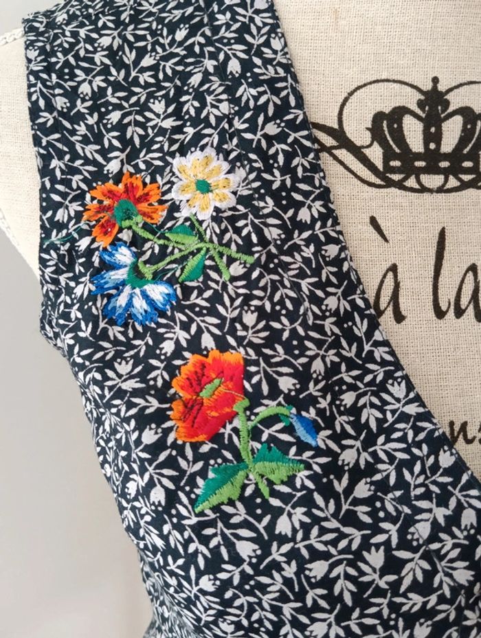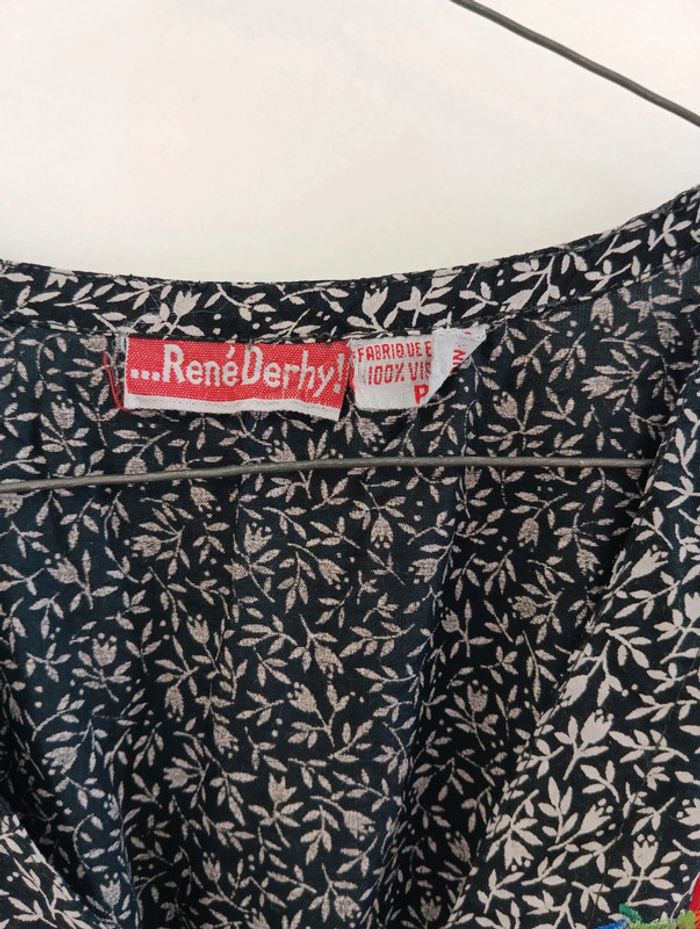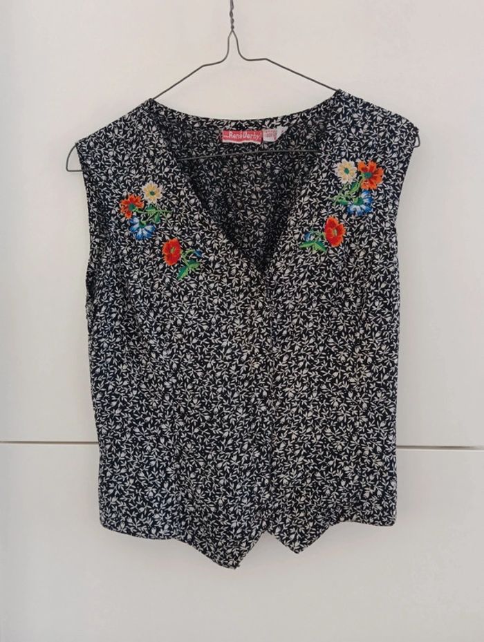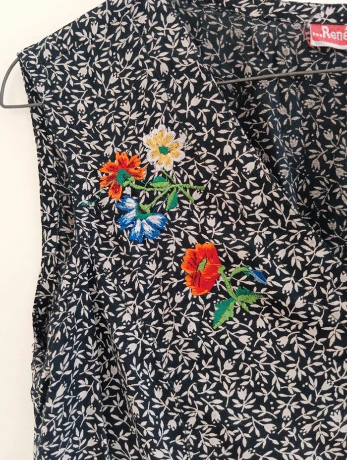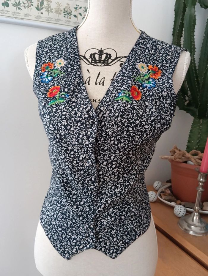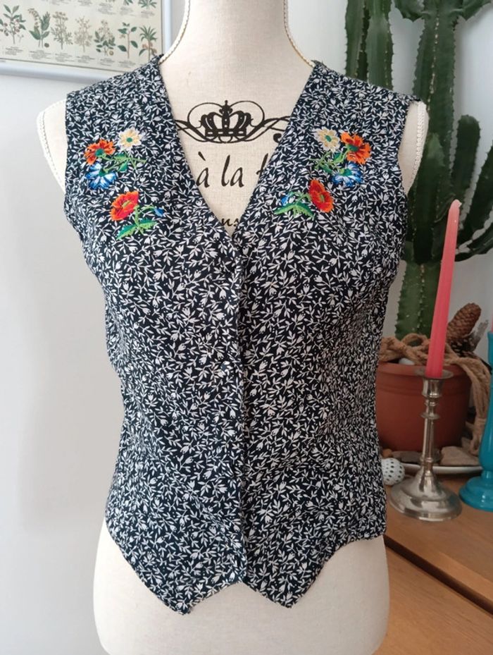 Blouse vintage coupe gilet garçon de café René Derhy 100% viscose Noir et blanc Broderies fleurs multicolores au niveau de la poitrine Lien au dos pour ajuster la taille Taille S à confirmer avec les mesures. Mesures Épaules 38cm Aisselles 47cm Longueur 53cm