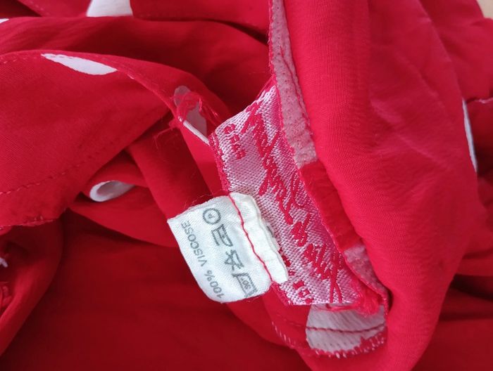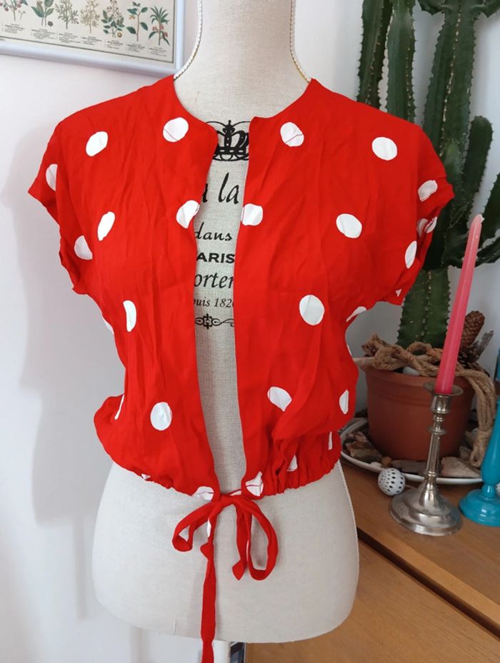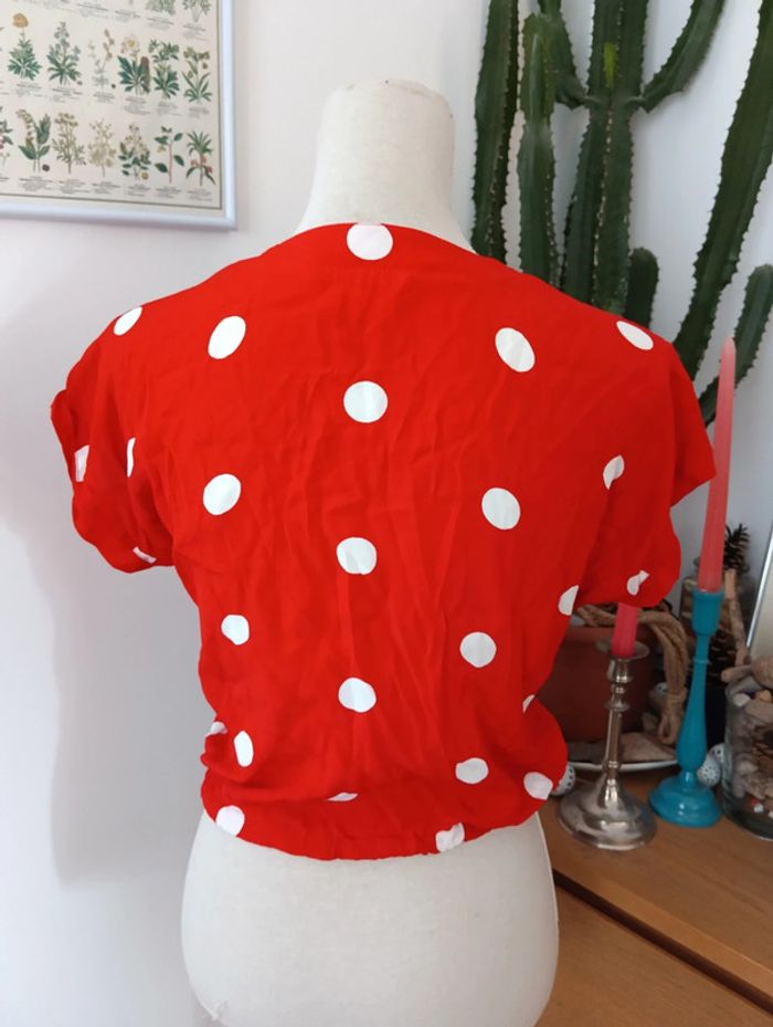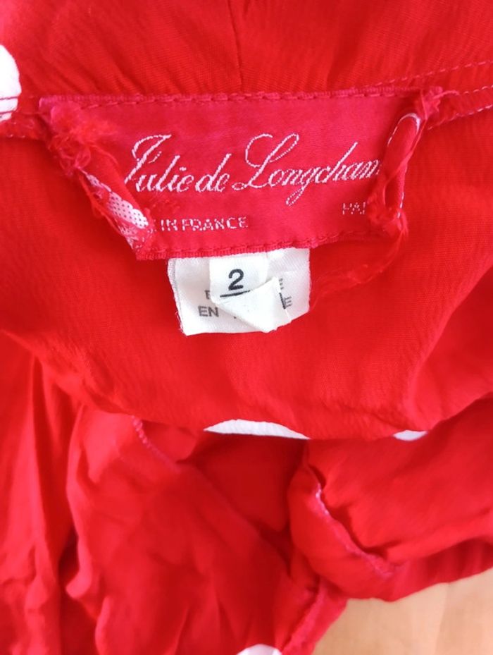 Top rouge à pois vintage Julie Longchamp made in France 100% viscose Taille 2 indiquée doit correspondre à 36 à confirmer avec les mesures Lien en bas Epaules 42cm Aisselles 41cm Longueur 42cm