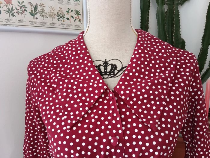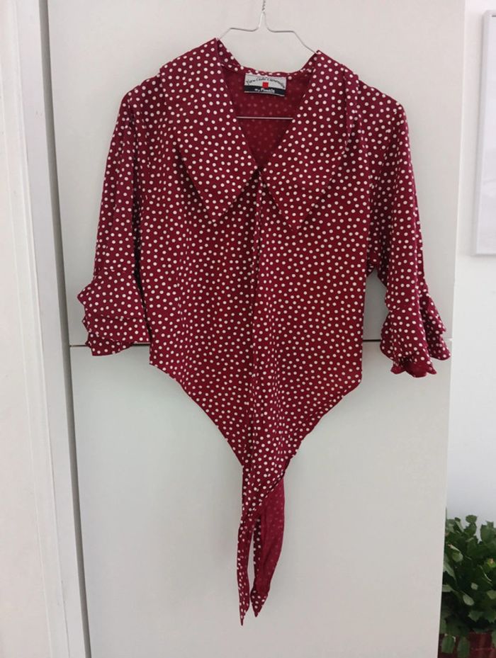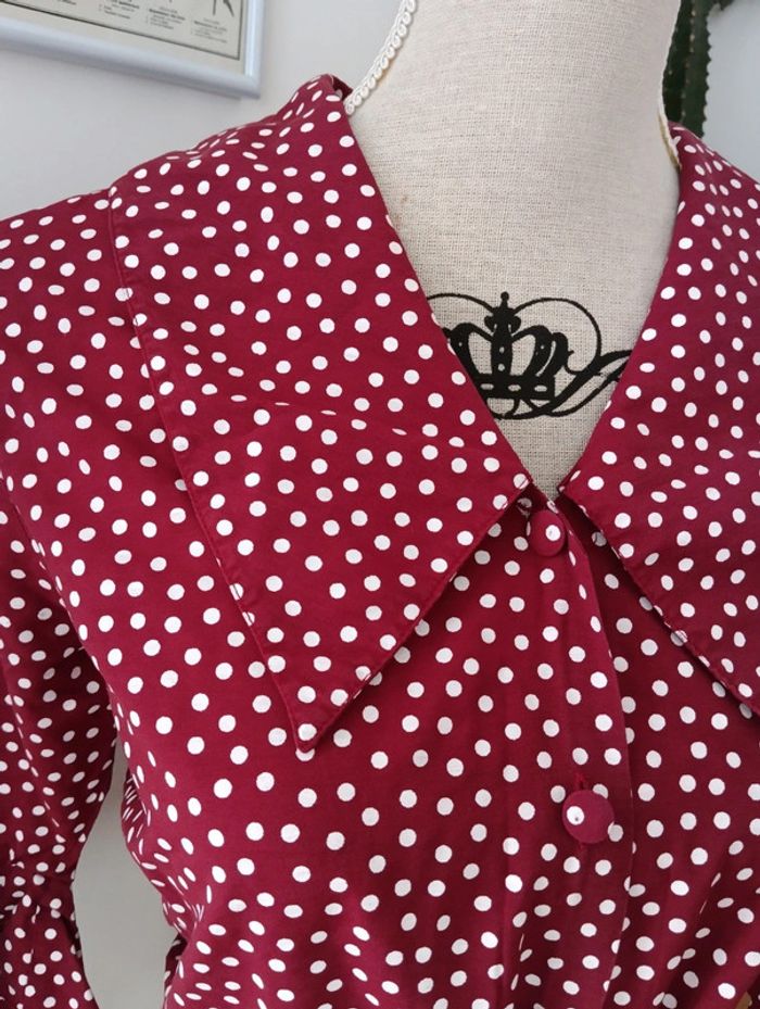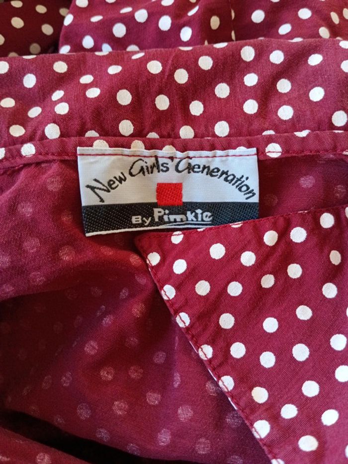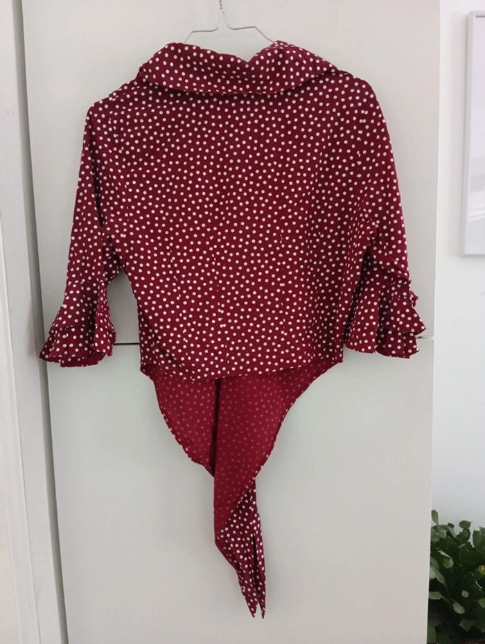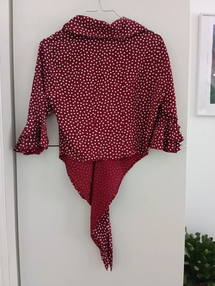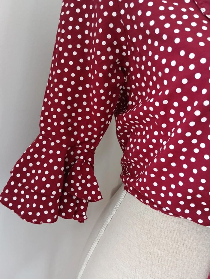 Chemise vintage crop à nouer Bordeaux à pois blancs 80% viscose Grand col Manches 3/4 volantées Pimkie vintage Taille 36 à confirmer avec les mesures Epaules 38cm Aisselles 44cm Longueur 44cm