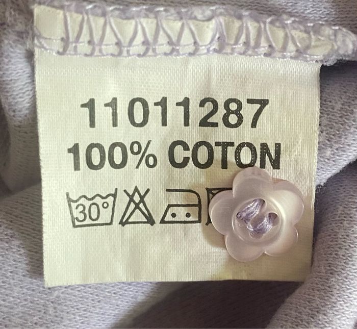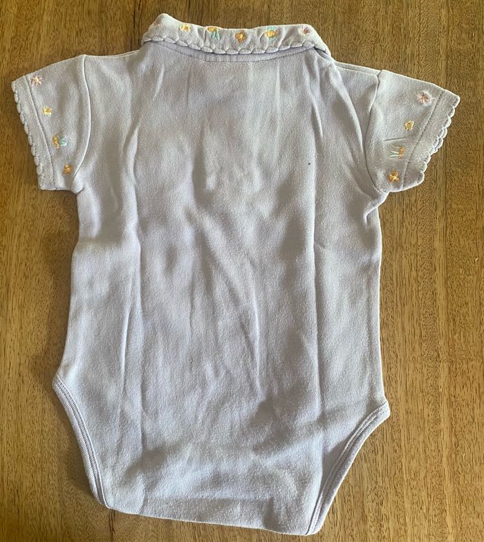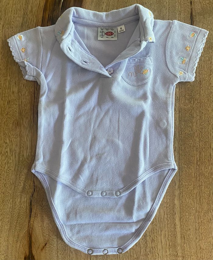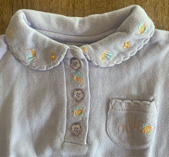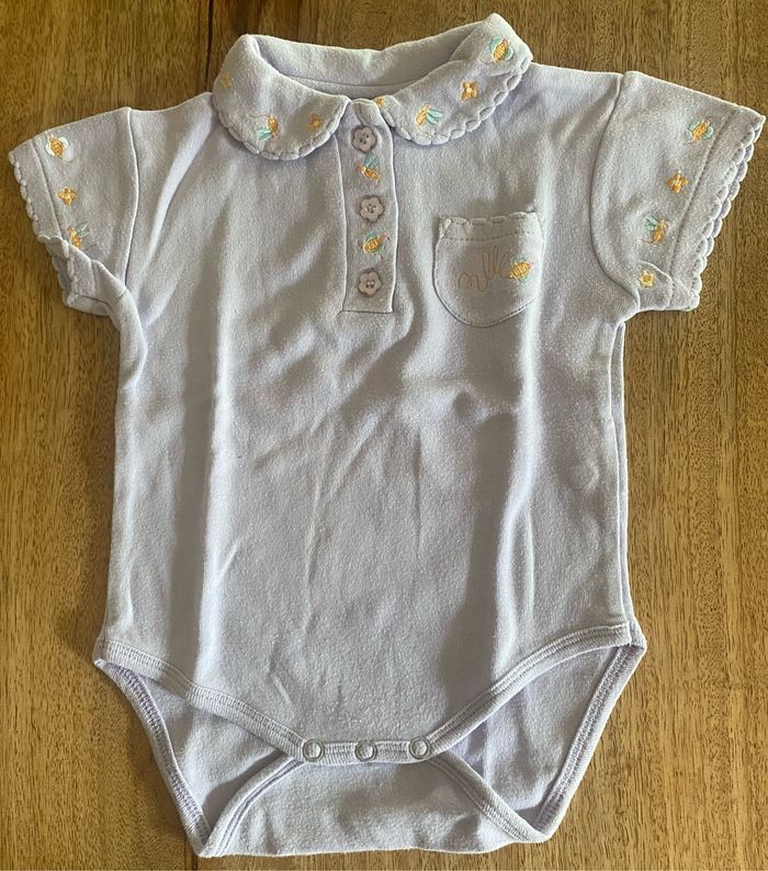 Body, violet, sans tache. Ouverture du col avec 3 boutons à fleurs Ouverture du body avec 3 pressions. Des broderies sur les manches et le col avec des fleurs, papillon et abeilles 100 % coton.