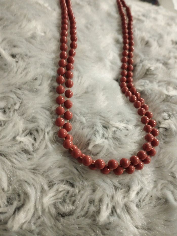 Long collier, sautoir en perles en plastique Très bon état Couleur corail/vieux rose