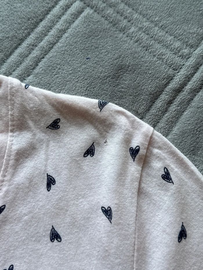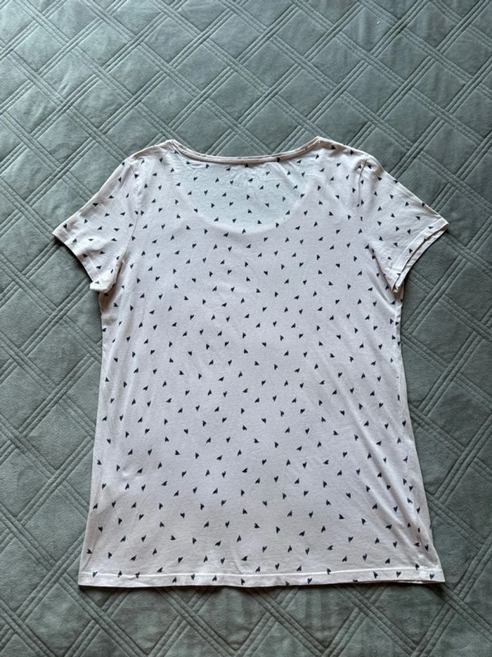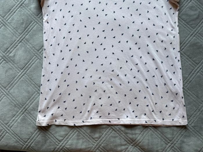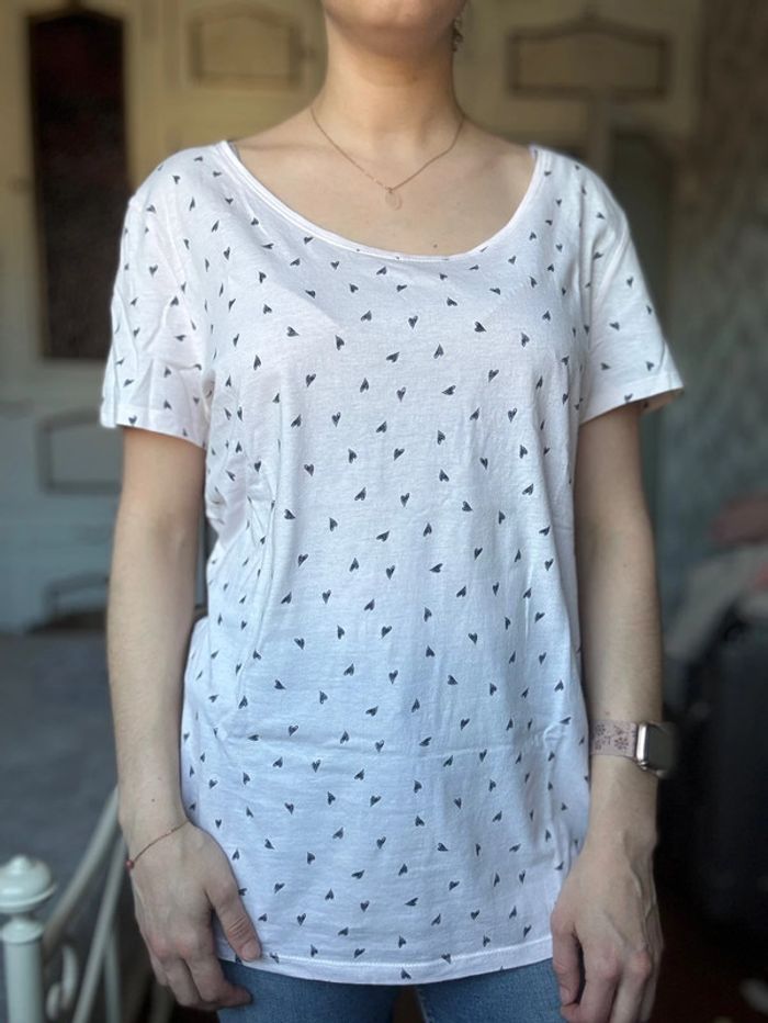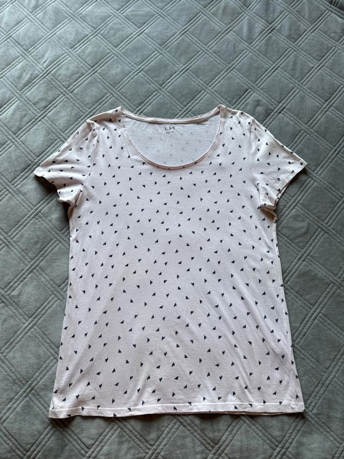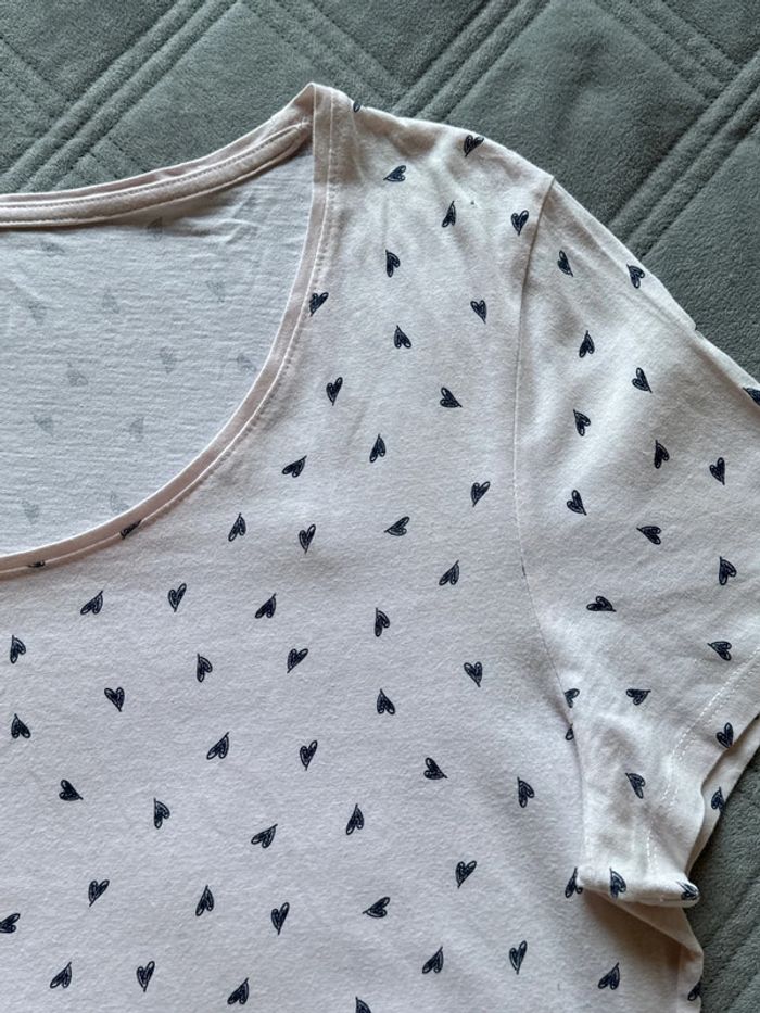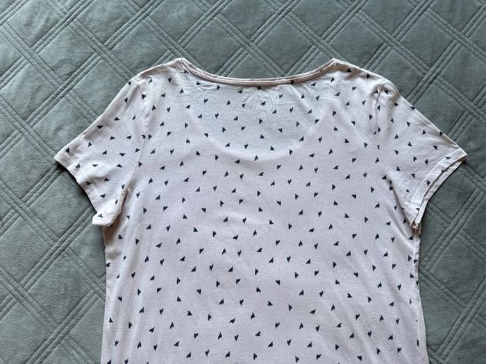 t-shirt La Halle en taille XL, imprimé de petits cœurs bleu marine. • Coloris rose clair, coupe droite et confortable • Tissu fluide et léger, agréable à porter • Très bon état général, avec un petit trou discret en haut près de l’encolure (voir dernière photo) Mesures: Épaules 45cm Aisselles 54cm Longueur 72cm 📦Envoi rapide et soigné 📣N’hésitez pas à faire des lots les réductions sont activés Et si vous avez des questions je suis là