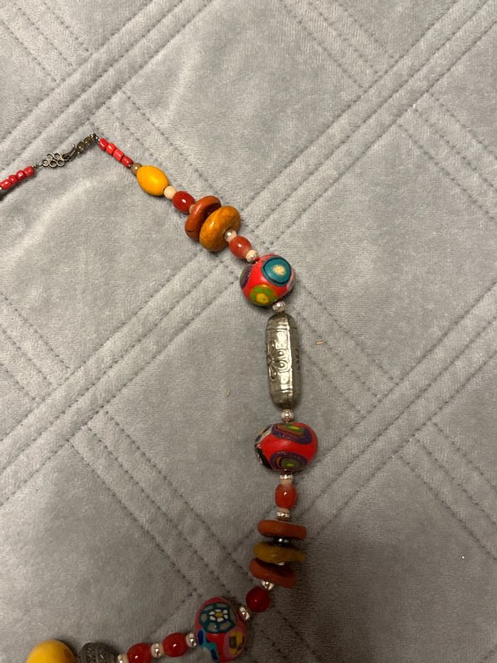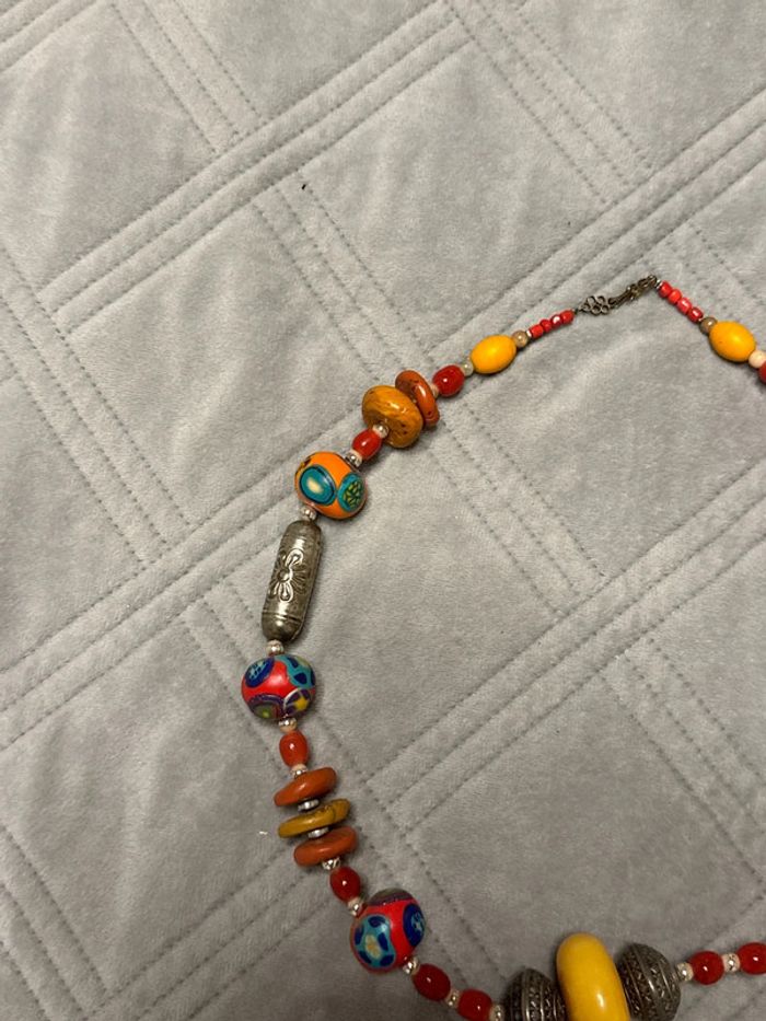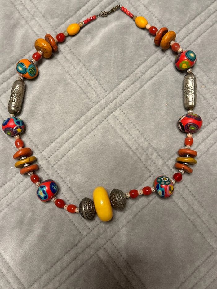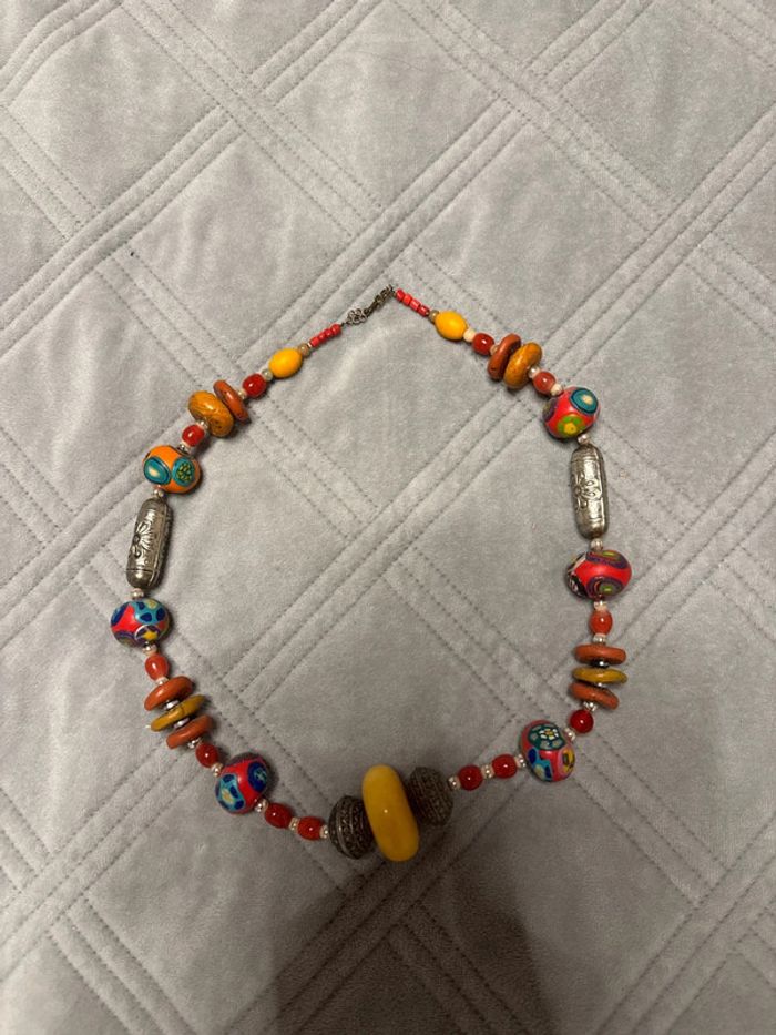 Collier fantaisie composé de grosses perles colorées (pâte polymère, résine, métal gravé, etc.) dans un style ethnique et chaleureux. Design unique, parfait pour affirmer son style avec une pièce forte. Très bon état – idéal pour les fans de bijoux artisanaux, colorés et faits main. Envoi rapide et soigné N’hesitez pas si vous avez des questions