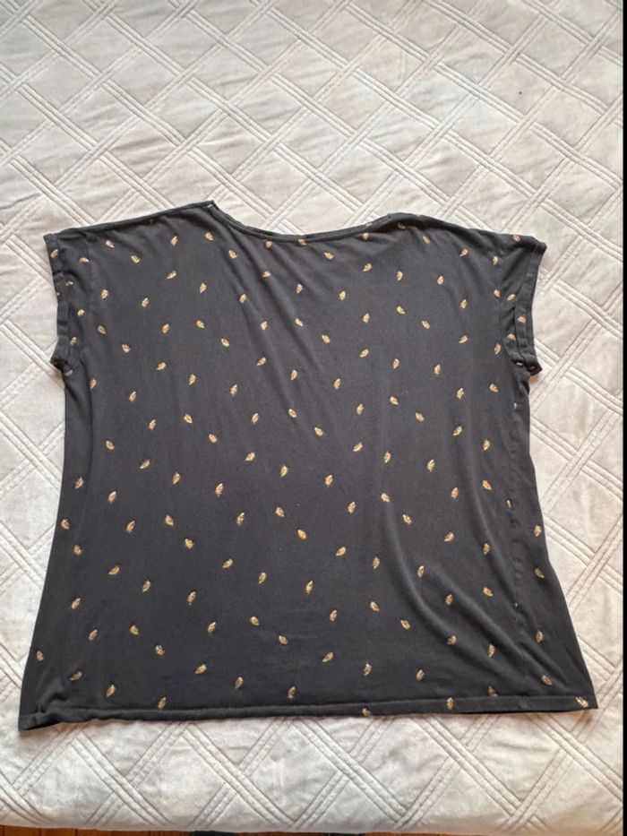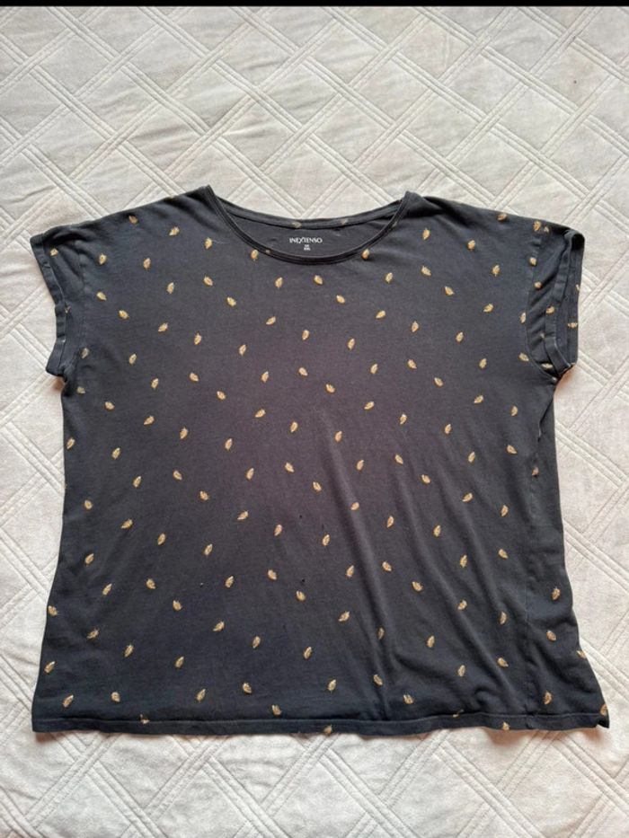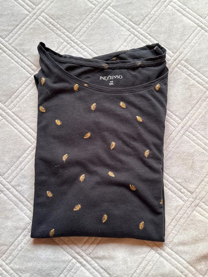 T shirt noir avec imprimé feuilles doré Bon état, quelques petits trous à l’avant du t shirt Marque: inextenso Taille : XXL 100% coton Envoi rapide et soigné N’hésitez pas si vous avez des questions