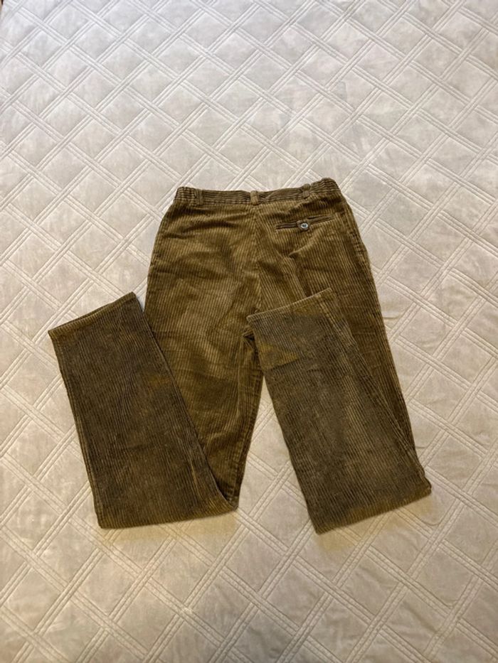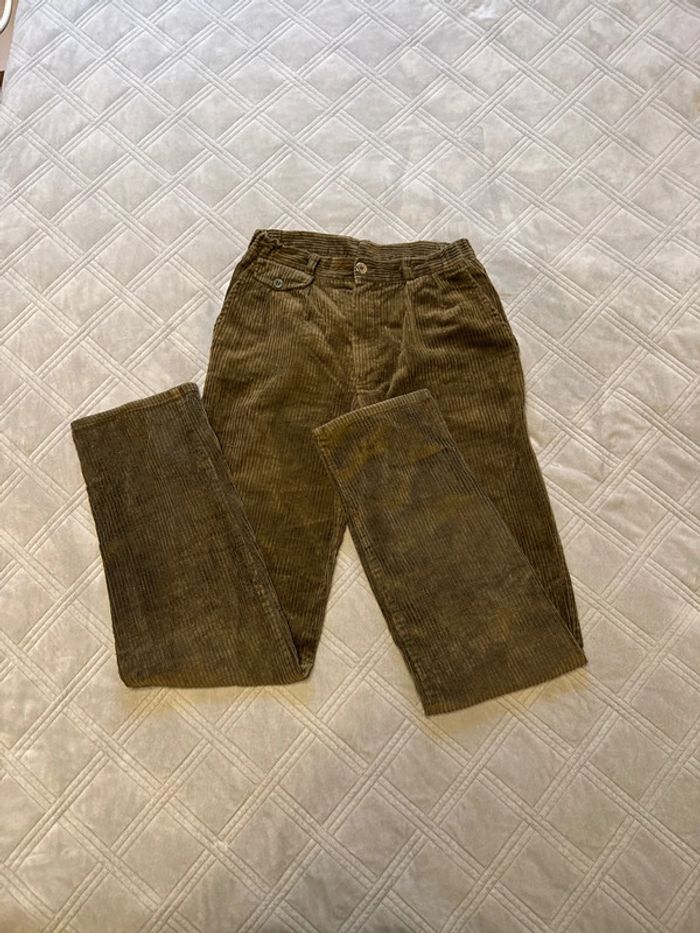 Pantalon kaki taille haute coupe droite, côtelé style velour Je ne connais pas la marque taille 38 bon état Tour de taille 33cm Hauteur 27cm Longueur de l’entrejambe 82cm Longueur totale 107cm Cheville 19cm Envoi rapide et soigné N’hésitez pas si vous avez des questions