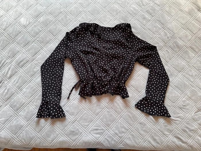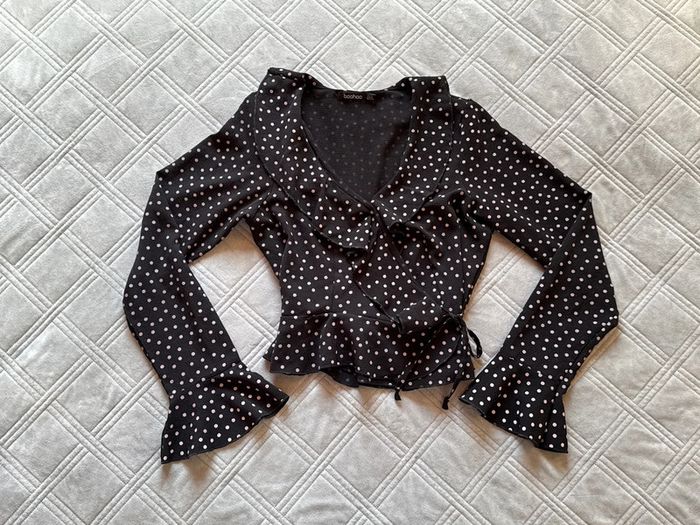 Blouse légère à manches longues à pois noir avec volants - taille L - Boohoo - très bon état - photo numéro 1