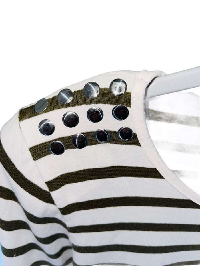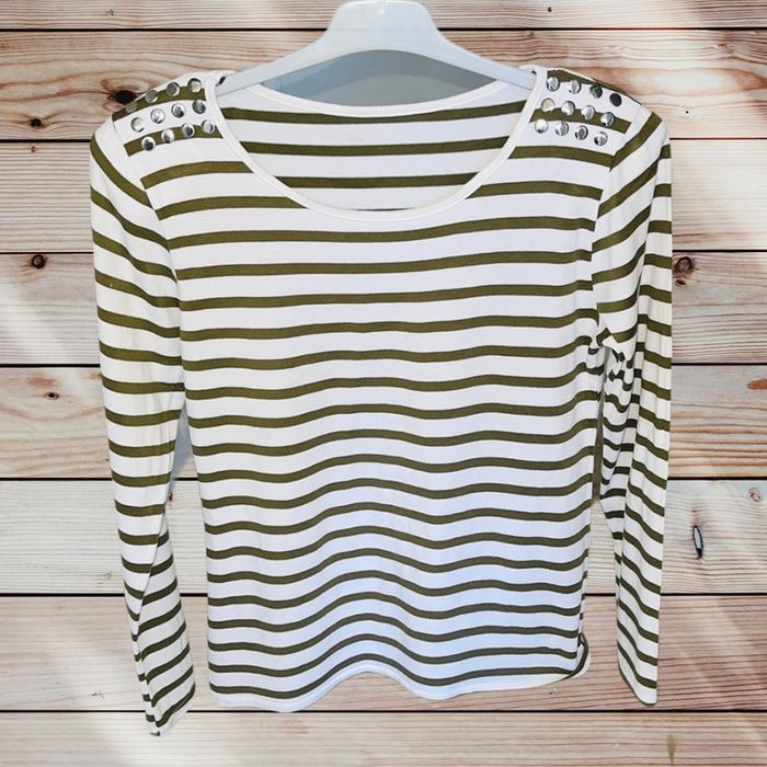 très beau t-shirt manches longues col rond en viscose et elastane style marinière blanc et khaki épaules détachables boron argent de chaque côté des épaules taille unique mentionné dur l’étiquette mais convient à une personne faisait du 38 fabrique en France ENVOI MONDIAL RELAY ou RELAIS COLIS ou CHRONO SHOP2SHOP UNIQUEMENT aucun envoi Colissimo