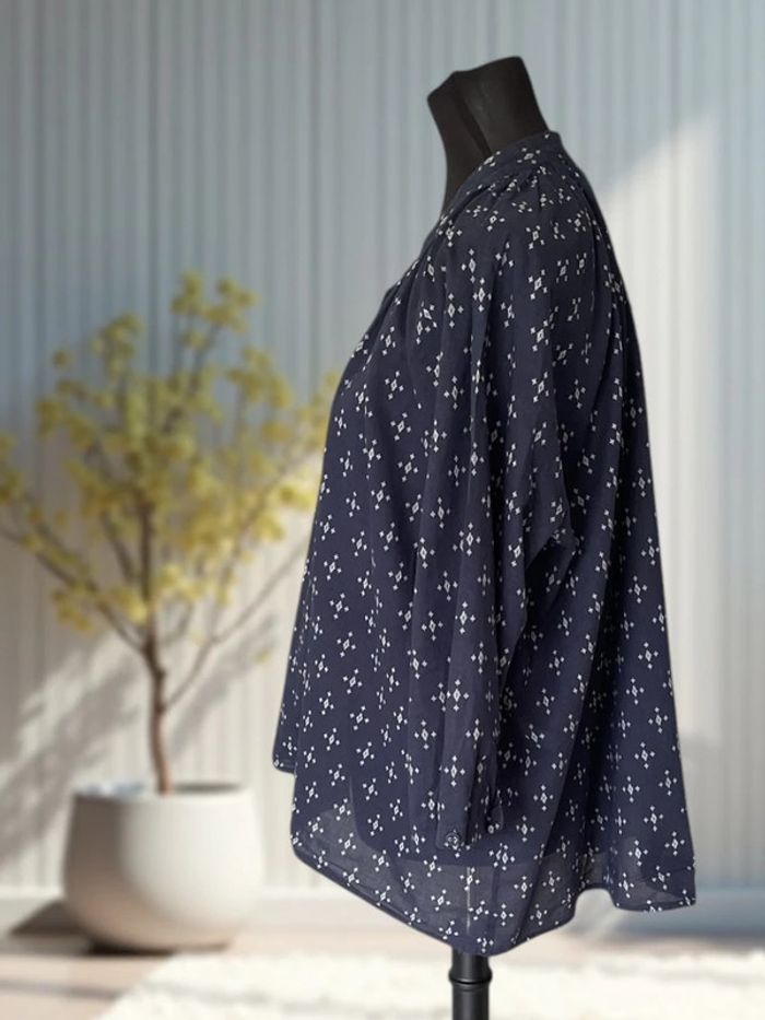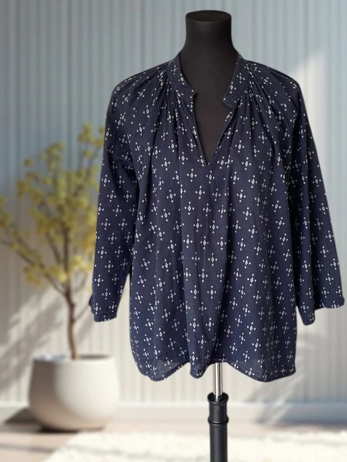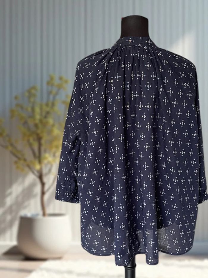 ℹ️ Blouse H&M bleu marine à imprimé graphique blanc – coupe ample et moderne, avec col tunisien et plis froncés aux épaules – parfaite pour une silhouette décontractée chic, à associer facilement avec un jean ou un pantalon fluide. ✔ Col tunisien fendu sans bouton, style décontracté mais structuré ✔ Fronces à l’encolure pour un joli volume fluide et confortable ✔ Manches 3/4 légèrement bouffantes ✔ Imprimé géométrique blanc sur fond bleu marine foncé – classique et facile à associer ✔ Base asymétrique, plus longue à l’arrière avec arrondi doux : flatteuse et moderne ✔ Tissu fluide en viscose mélangée : léger, respirant et doux au toucher 🏷 Marque : H&M 📏 Taille 40 📐 Dimensions : • Épaules : 55 cm • Poitrine (aisselles à aisselles) : 70 cm • Longueur devant : 60 cm • Longueur dos (estimée) : env. 70 cm • Manche extérieure : 50 cm • Manche intérieure : 30 cm 🌈 Couleur : Bleu marine foncé avec motifs blancs géométriques 🧵 Matière : Tissu léger type coton (étiquette absente) – texture douce, respirante et légère ✅ Très bon état 📦 Envoi rapide et soigné