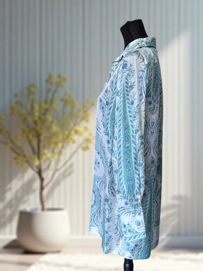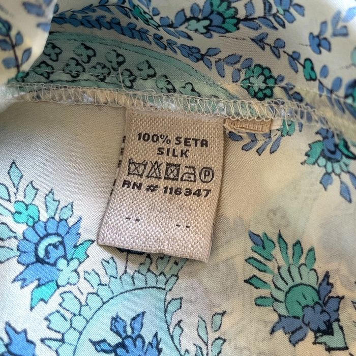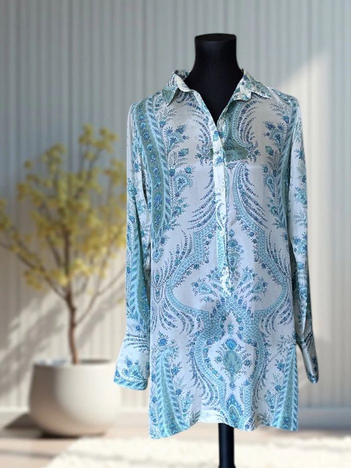 ℹ️ tunique Coast Weber Ahaus, confectionnée en 100% soie - imprimé délicat dans des tons bleu et vert sur fond blanc cassé - allure bohème chic, parfaite pour un look estival élégant. ✔ Coupe fluide et légère, idéale pour un confort absolu ✔ Col chemise et patte boutonnée, pour une touche sophistiquée ✔ Manches longues légèrement évasées, offrant un effet vaporeux et féminin ✔ Tissu 100% soie, doux et respirant, parfait pour la mi-saison et l’été 🏷 Marque : Coast Weber Ahaus 📏 Taille estimée : S (pas d’étiquette) – Correspond à une taille 36 📐 Dimensions : • Épaules : 35 cm • Poitrine : 50 cm • Longueur totale : 80 cm • Manche (intérieur) 55cm • Manche (extérieur) 65cm 🌈 Couleurs : Bleu, vert et blanc cassé – Motif inspiré des imprimés cachemire 🧵 Matière : 100% soie ✅ Très bon état – Peu porté, tissu impeccable 📦 Envoi rapide et soigné