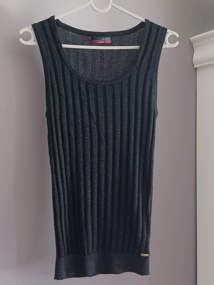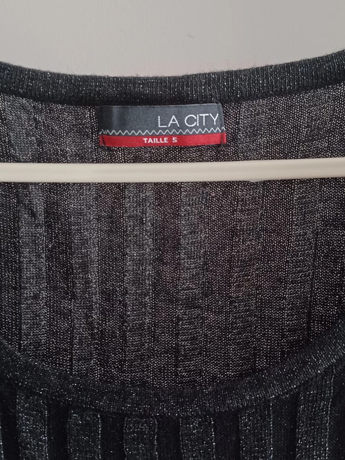 Maille avec fils métallisés argentés. Impeccable, très peu porté. Maille extensible (taille comme un 36) Taille 34/36