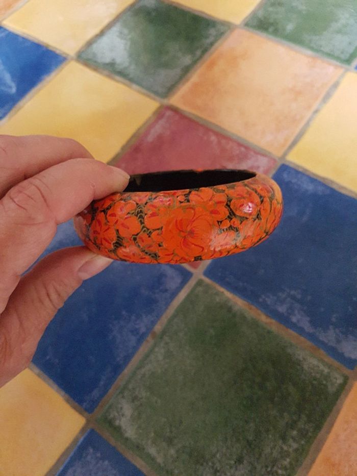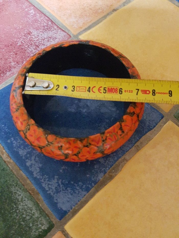 Adorable bracelet à fleurs oranges Diamètre intérieur 6,5 cm, épaisseur 2,5 cm Je ne sais pas en quelle matière il est, ça ne me semble pas être du plastique! Un léger éclat de peinture sur la partie interne, ne se voit pas porté, voir dernière photo