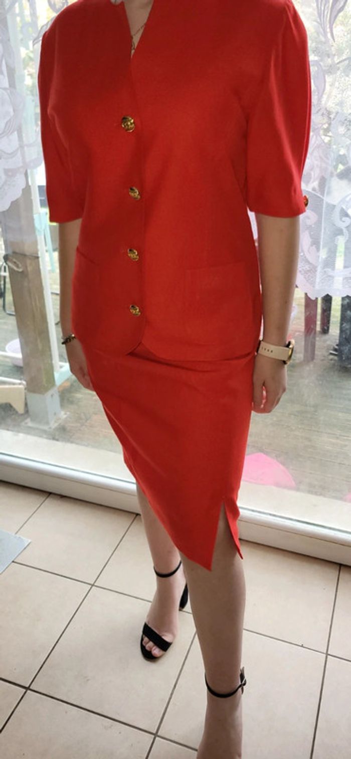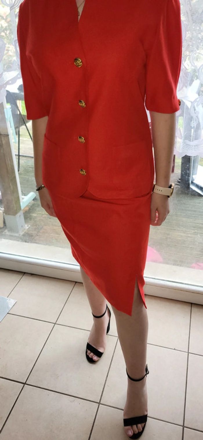 Magnifique Ensemble tailleur jupe vintage , rouge .Composé d'une veste à manches courtes avec boutons dorés et d'une jupe midi avec une petite fente élégante. Parfait pour un look chic et rétro. Taille : 38/40 État : Excellent Marque : Devernois Paris Idéal pour un événement habillé, une soirée ou même au bureau avec du style ! Porté ici avec des talons noirs pour un look raffiné. Seul défaut, les épaulettes qui se abîmé que je n'ai pas couper au cas où vous souhaiteriez les remplir à nouveau. #a2life_taille38 #a2life_taille40