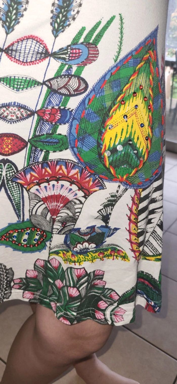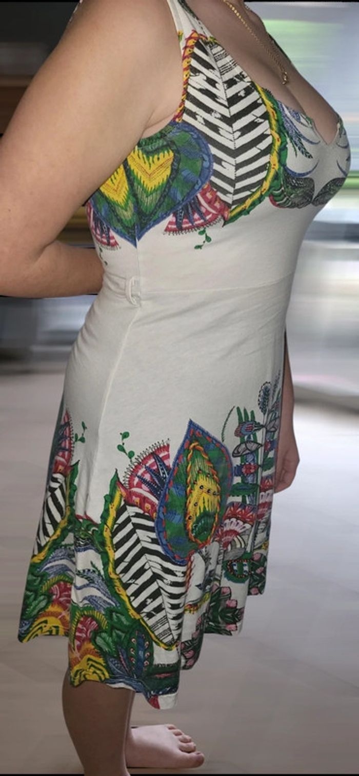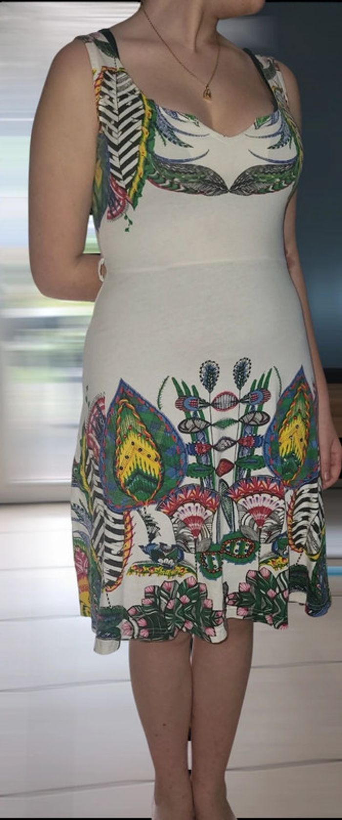 Superbe robe sans manches avec un décolleté en V. Tissu léger et agréable à porter, parfait pour l'été ou une occasion spéciale. Motifs colorés et originaux : feuilles, plumes et formes géométriques dans des teintes vibrantes (vert, jaune, rouge, bleu). Très bon état. Pleins d'autres vêtements à petits prix #a2life_taille34