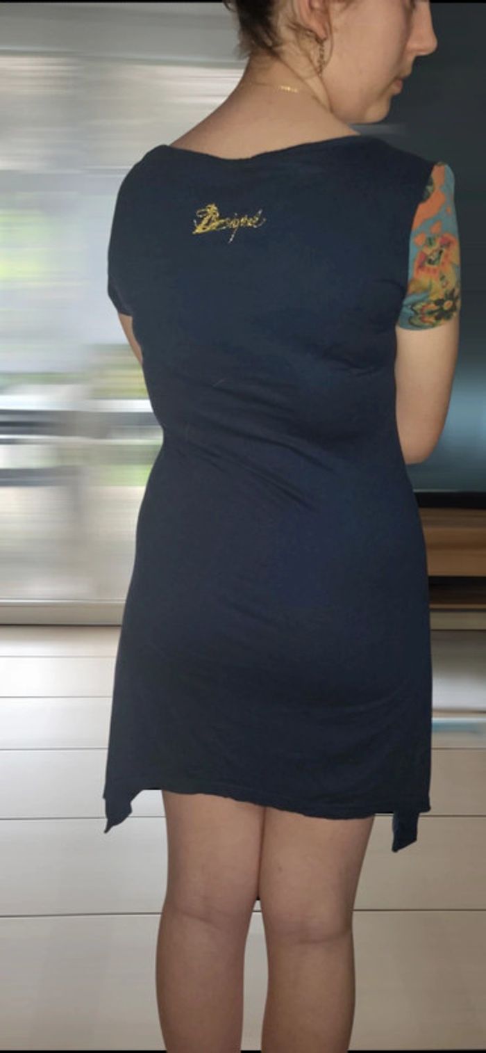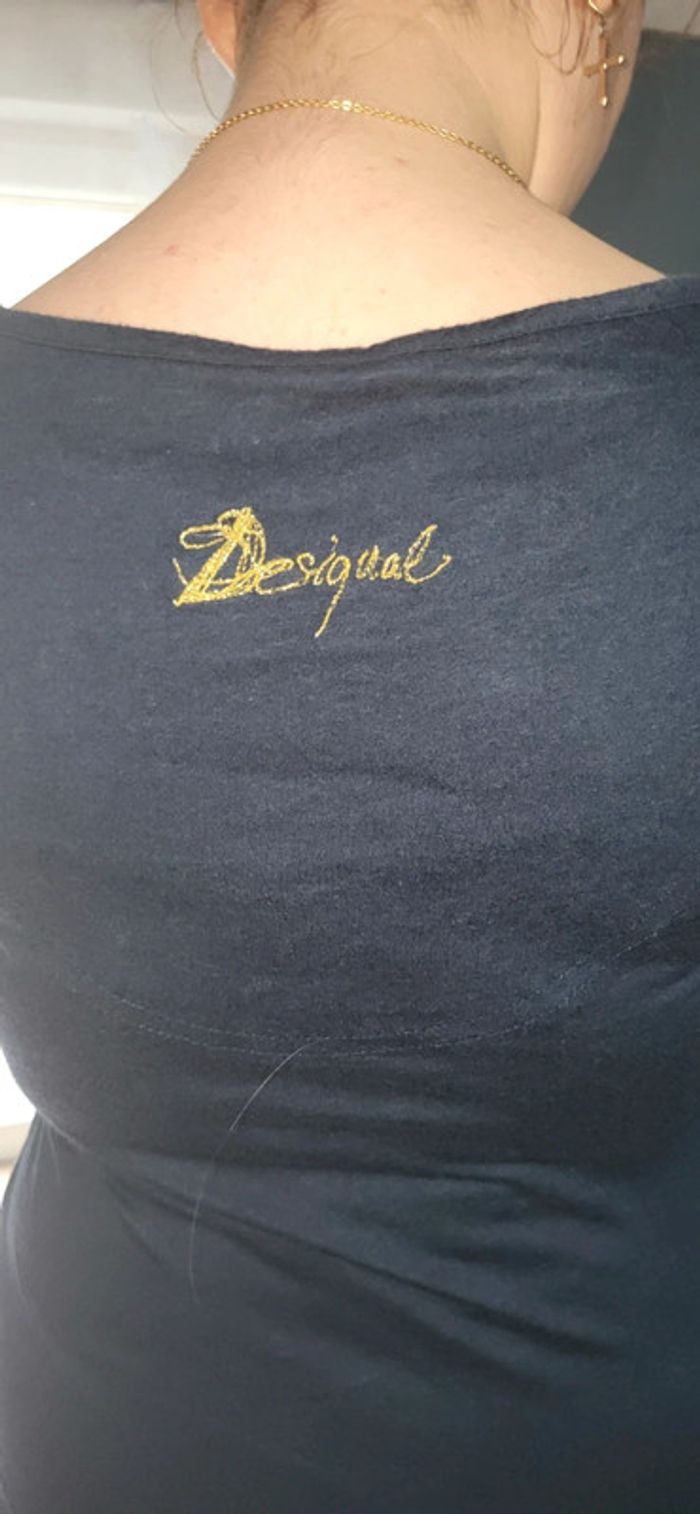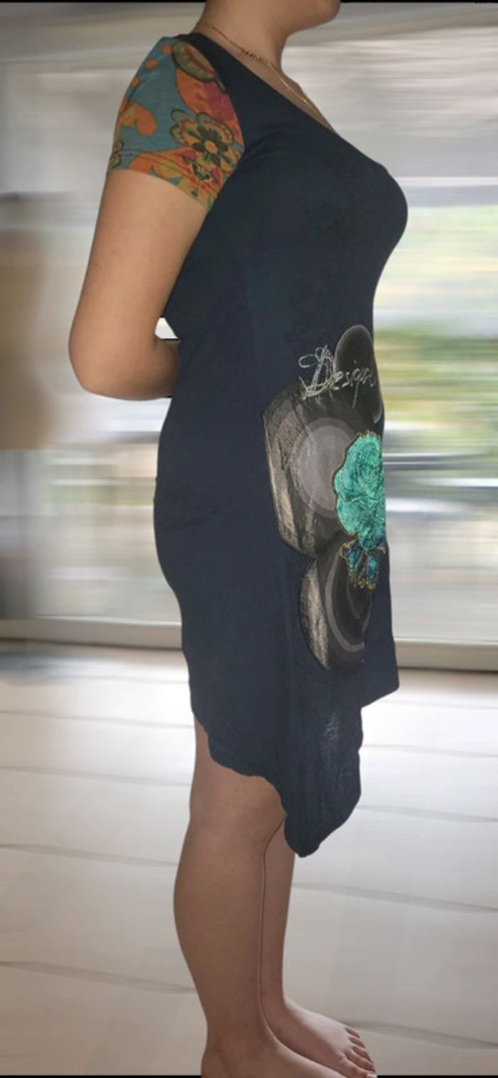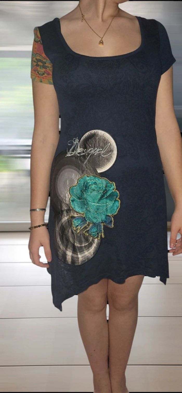 **Description** : magnifique robe bleu marine de la marque Desigual. Elle est ornée d'une grande broderie florale turquoise avec des détails dorés sur le côté gauche, ainsi que du logo "Desigual" en blanc. La robe a une encolure arrondie et des manches courtes, parfaite pour une tenue élégante et décontractée. - **Taille** : S - **État** : Très bon état Plein d'autres vêtements à petits prix #a2life_taille36