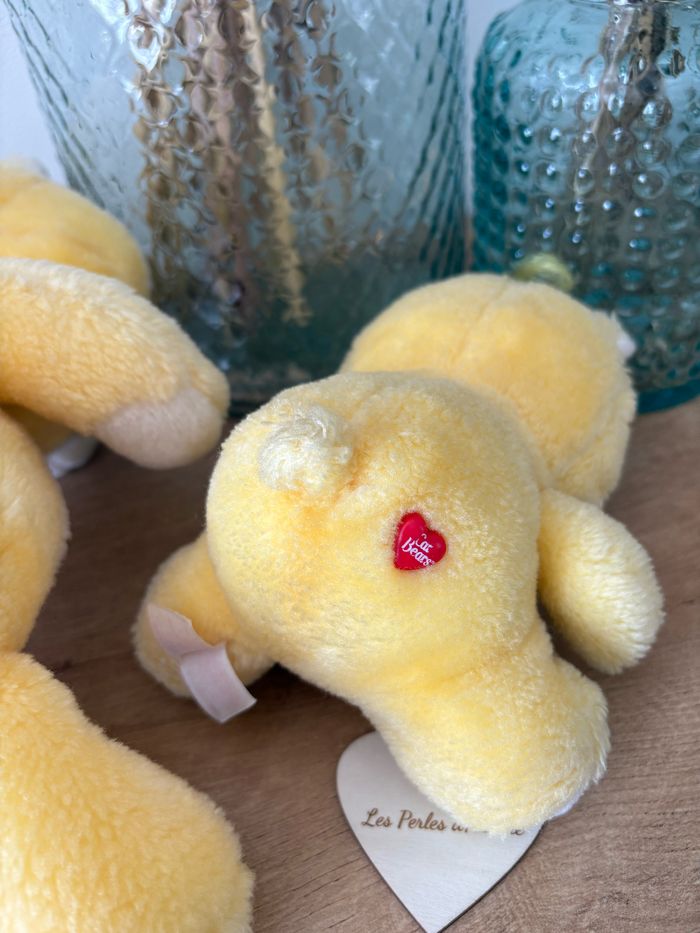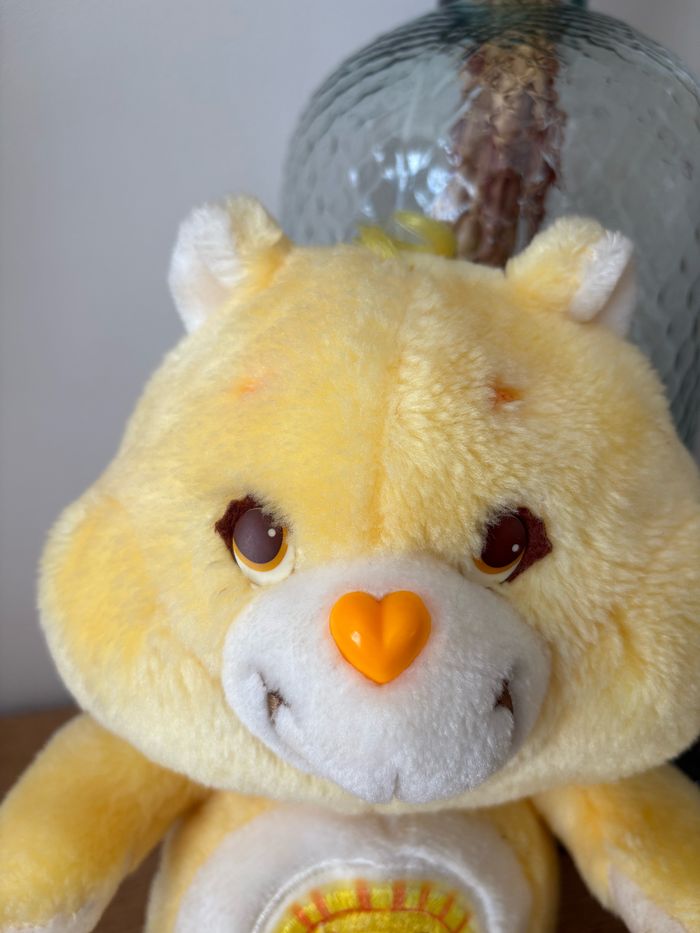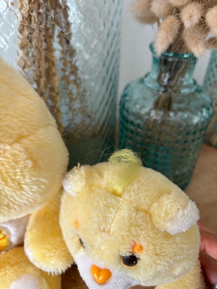 2 bisounours vintage Petit et grand modèle Funshine soleil jaune au centre Avec leur mèche ! Le grand est en très bon état! Il y a l'étiquette, le nez et les yeux ainsi que le cœur care bears sont comme neuf (Sur le soleil il y a un peu de noir) Non lavé pour ne pas les abîmés, je vous laisse le soin de le faire .