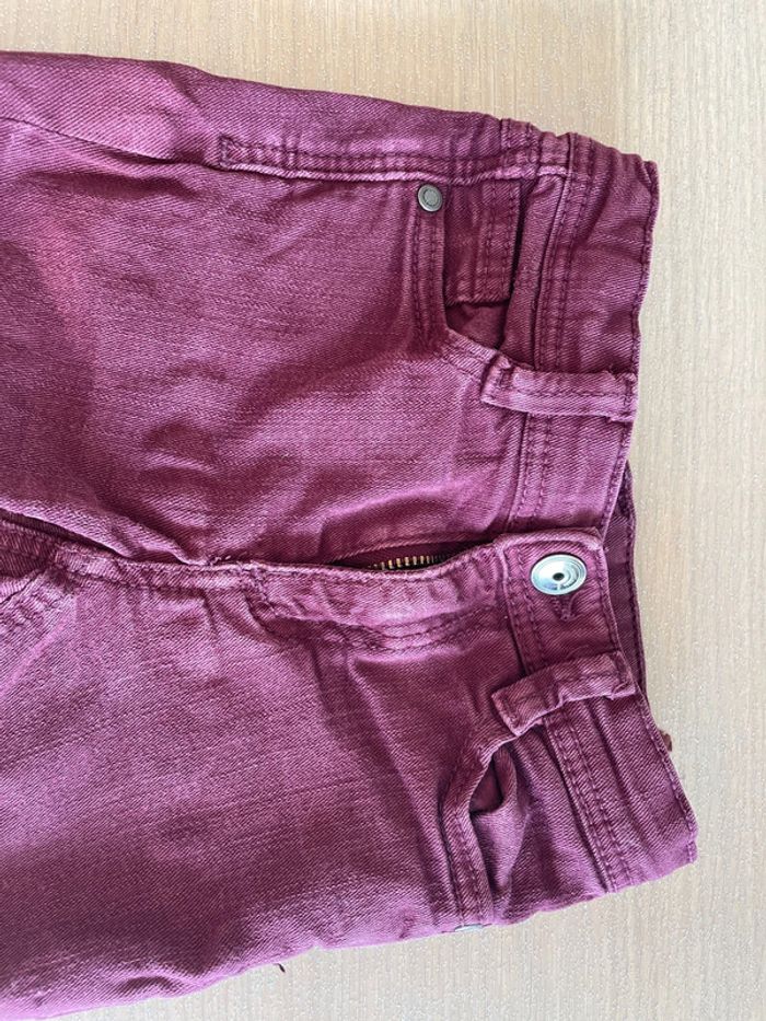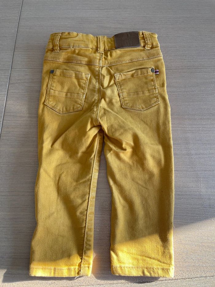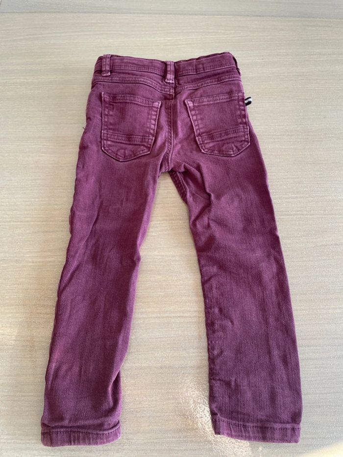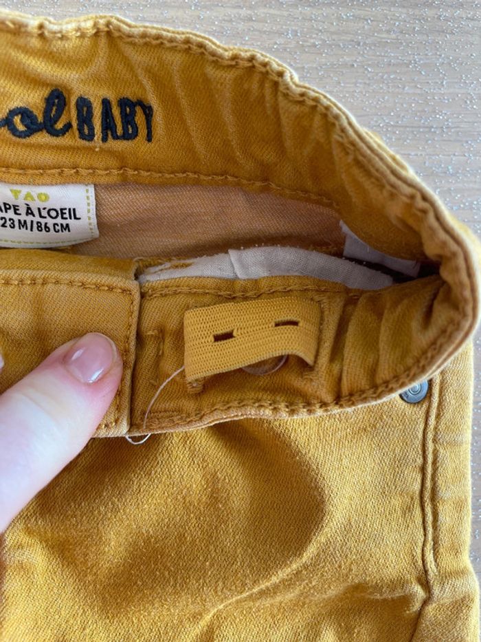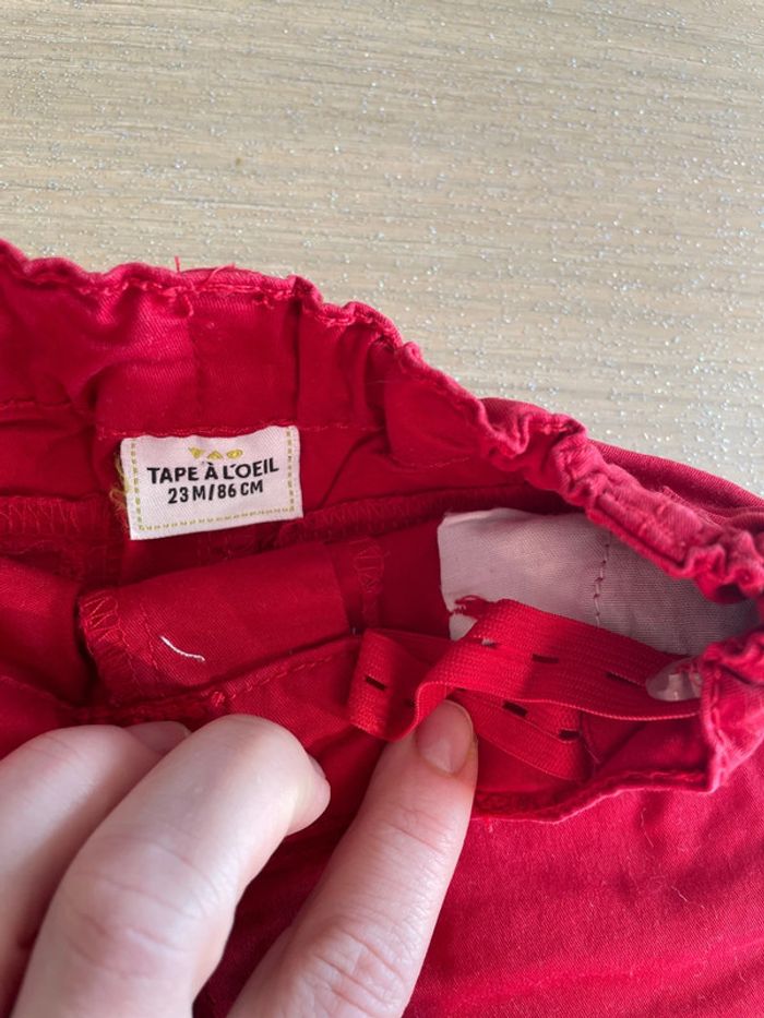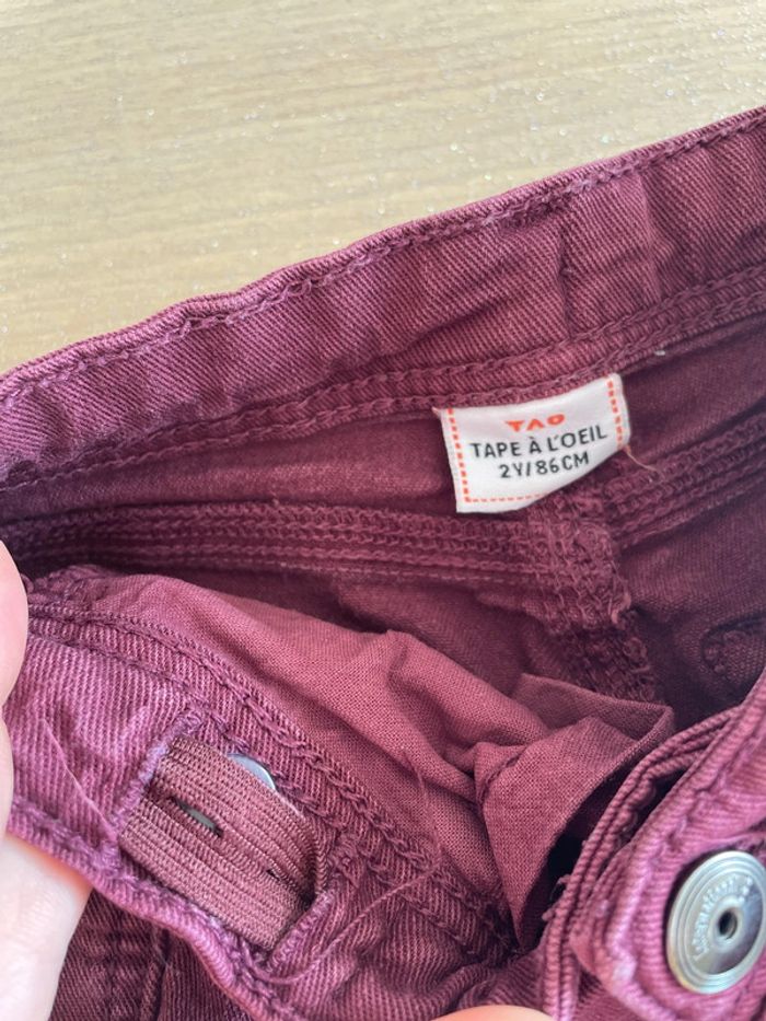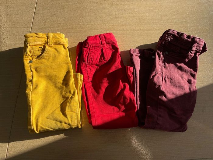 Tape à l’œil 2 ans Taille ajustable Le jaune est un peu décoloré sur les genoux Le rouge est comme neuf porte une ou 2 fois Et le prune a l’élastique un peu abîmé mais gêne pas l’utilisation
