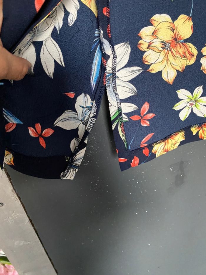 Prix ferme ! Veste fleurie légère Plus d’étiquette pour la matière ni taille Style crêpe Poches Revers aux manches Epaules de couture à couture 36 Sous les aisselles 48 Ne se ferme pas Longueur 66 #vestelongue #veste #printempsété #floral #pimkie #marine #chantalmatejavestes36 #chantalmatejamalo #chantalmateja2025