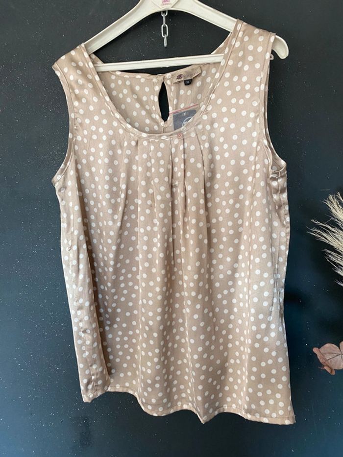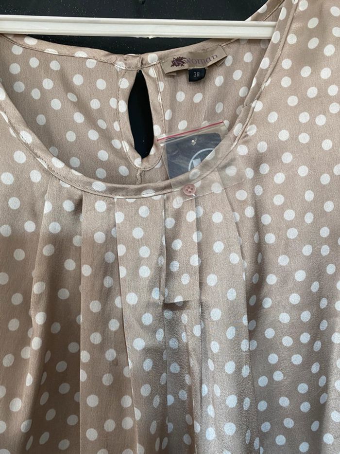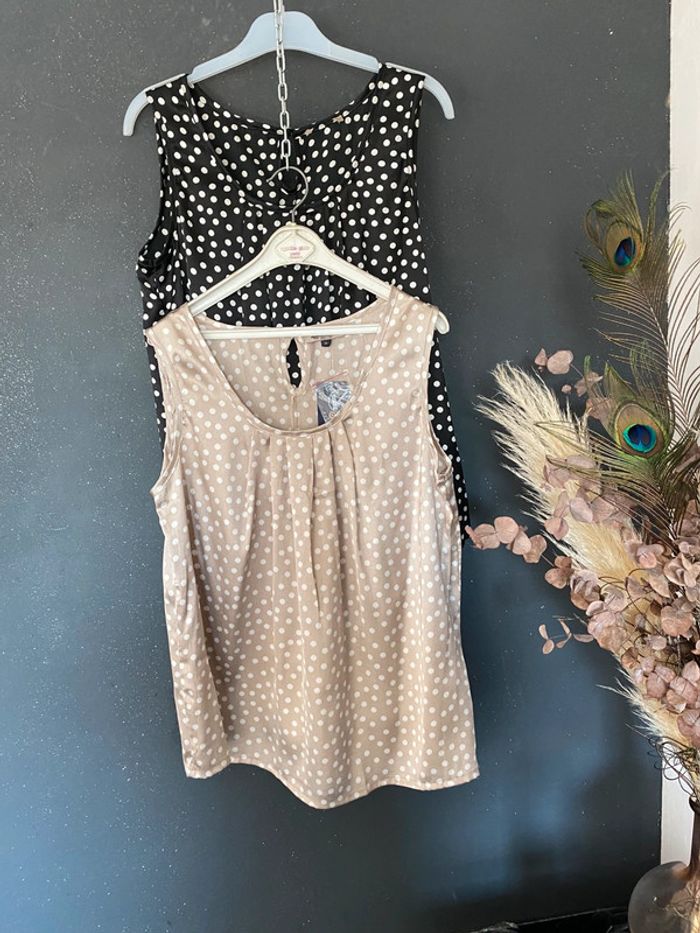 Lot 2 hauts un neuf avec étiquette et un neuf sans étiquette Polyester satiné Un beige pois blancs Un noir pois blancs #top #blouse #haut #kiabi #neufsansétiquette #neufavecetiquette #été #chantalmatejahauts38 #chantalmatejachame #chantalmateja2025