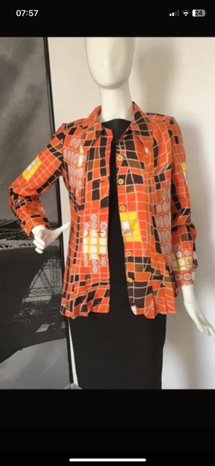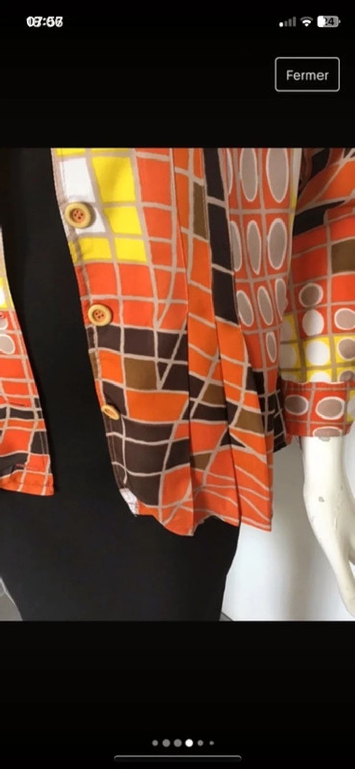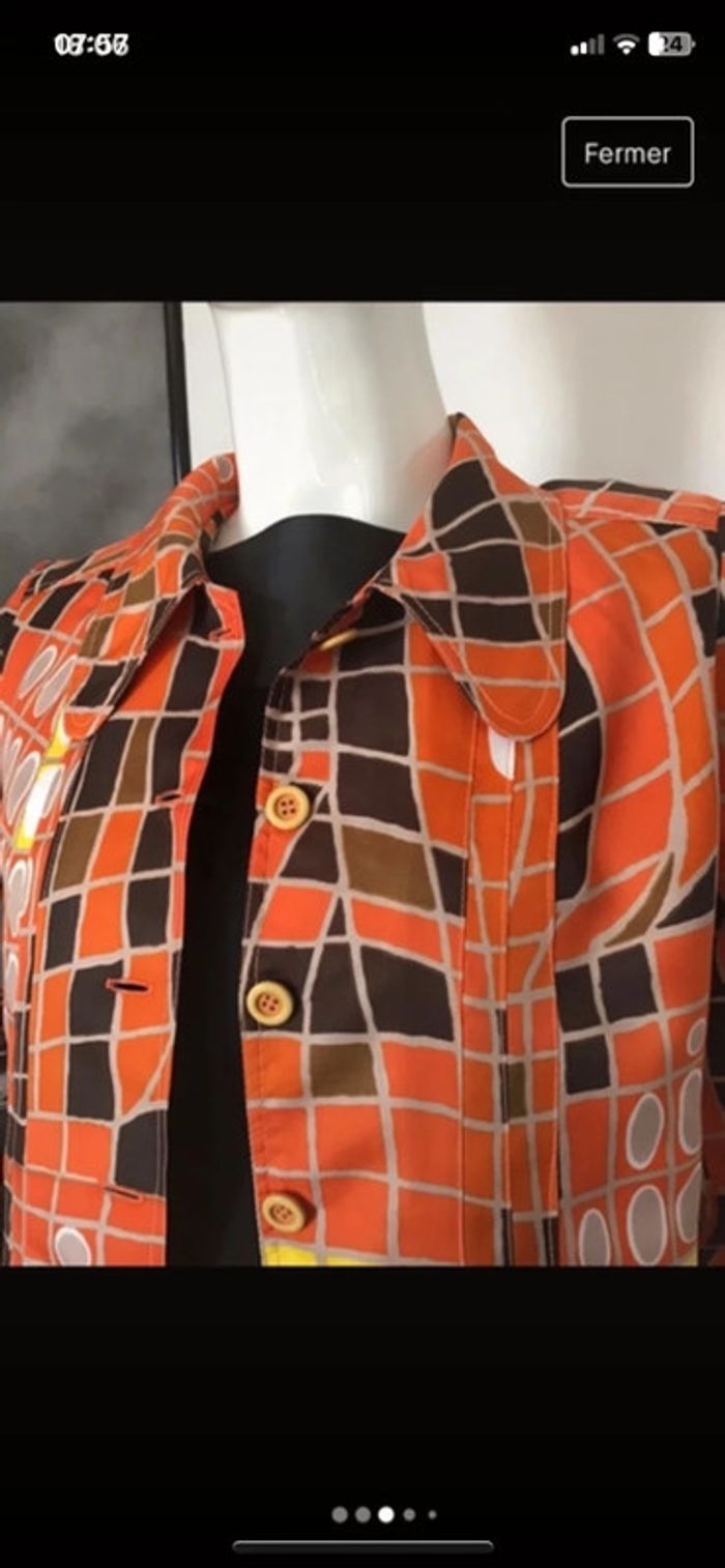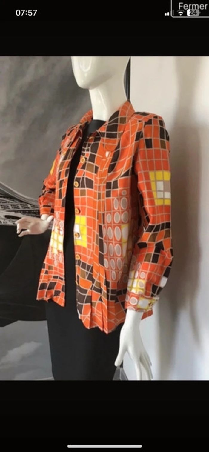 Veste colorée plus d’étiquette pour la matière qui est très soyeuse Epaules de couture à couture 38 Sous les aisselles 48 Longueur 64 forme cintrée Longueur des manches 57 Doublée Col arrondi Petits plis en bas devant Manque un bouton tout en bas A été recousue à une emmanchure forme un petit bec et deux ou trois fils tirés ceci fait partie des imperfections du vintage #vestefemme #vestevintage #70s #coloree #soyeuse #athypique #originale #orange #noir #chantalmatejavestes38 #chantalmatejachame #chantalmateja2025