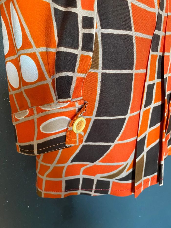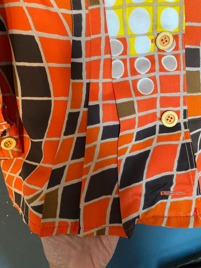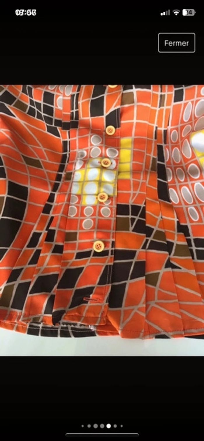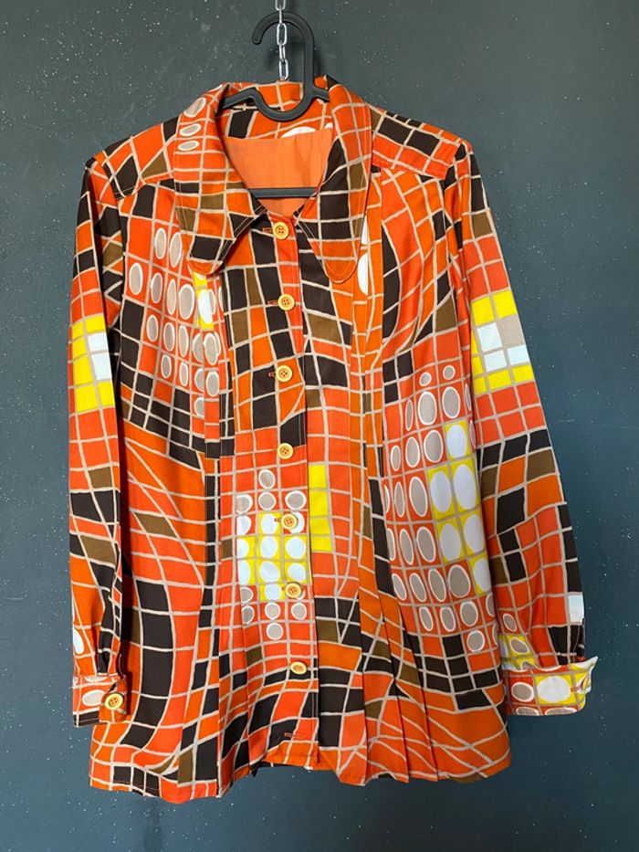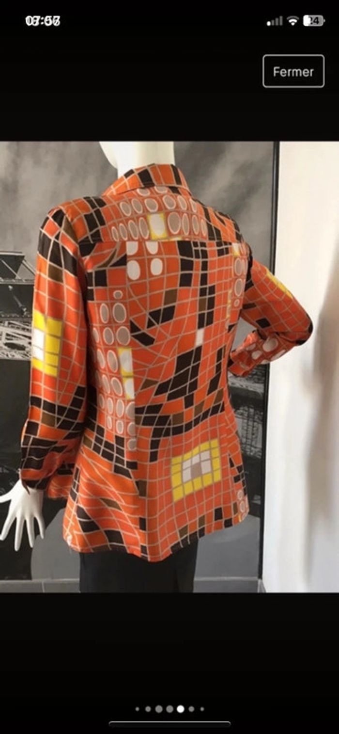 Veste colorée plus d’étiquette pour la matière qui est très soyeuse Epaules de couture à couture 38 Sous les aisselles 48 Longueur 64 forme cintrée Longueur des manches 57 Doublée Col arrondi Petits plis en bas devant Manque un bouton tout en bas A été recousue à une emmanchure forme un petit bec et deux ou trois fils tirés ceci fait partie des imperfections du vintage #vestefemme #vestevintage #70s #coloree #soyeuse #athypique #originale #orange #noir #chantalmatejavestes38 #chantalmatejachame #chantalmateja2025