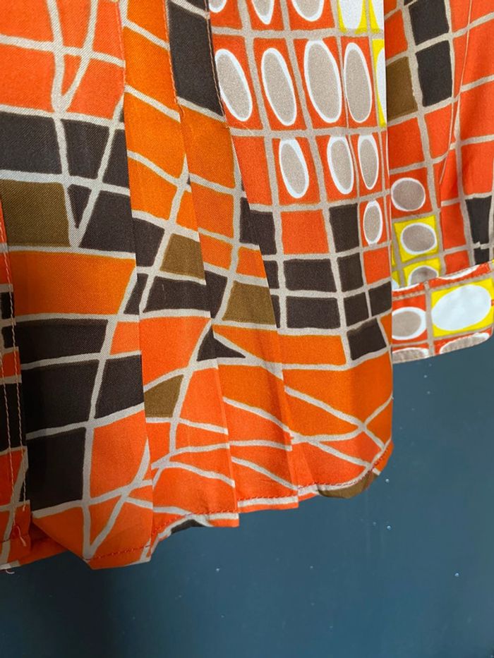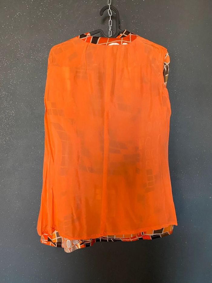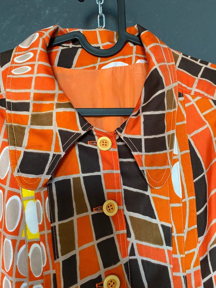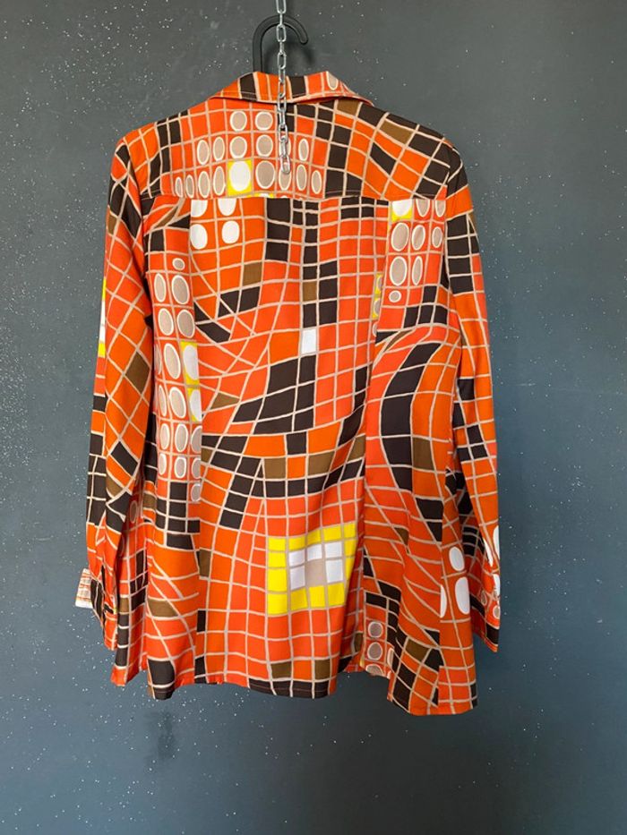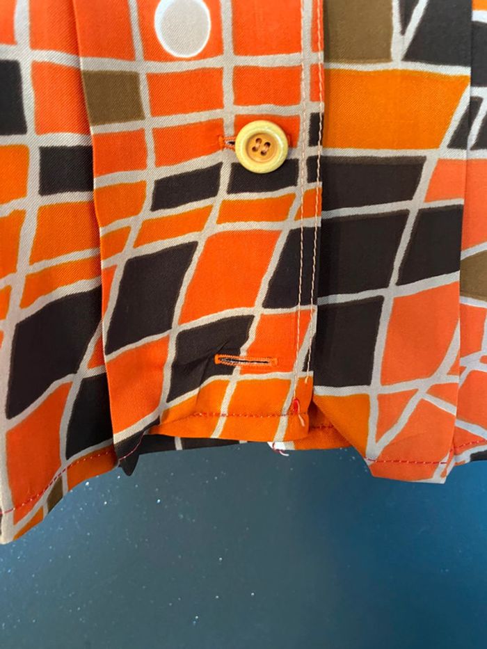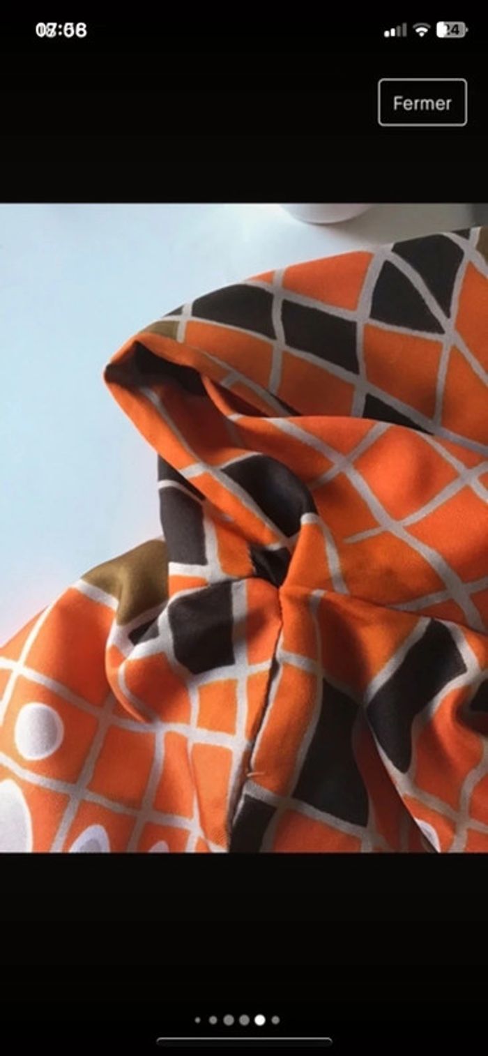 Veste colorée plus d’étiquette pour la matière qui est très soyeuse Epaules de couture à couture 38 Sous les aisselles 48 Longueur 64 forme cintrée Longueur des manches 57 Doublée Col arrondi Petits plis en bas devant Manque un bouton tout en bas A été recousue à une emmanchure forme un petit bec et deux ou trois fils tirés ceci fait partie des imperfections du vintage #vestefemme #vestevintage #70s #coloree #soyeuse #athypique #originale #orange #noir #chantalmatejavestes38 #chantalmatejachame #chantalmateja2025