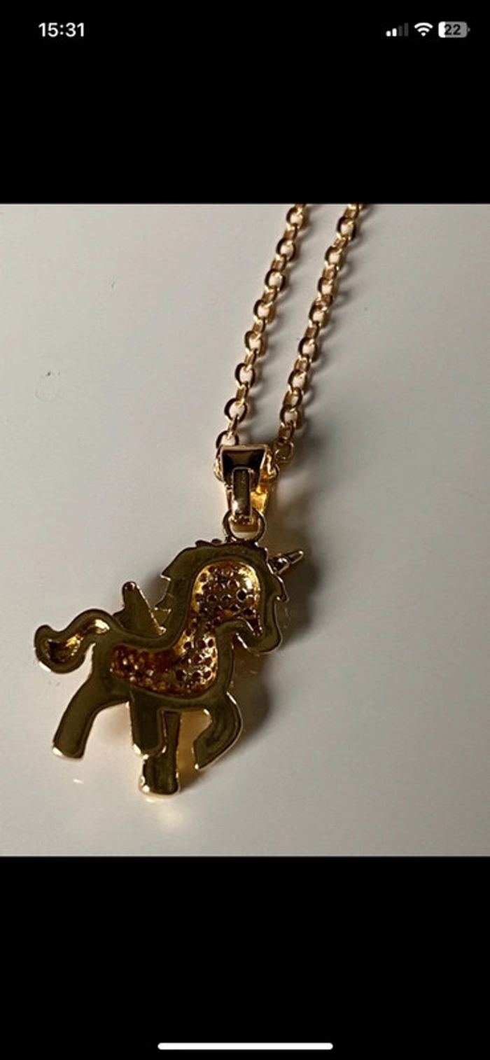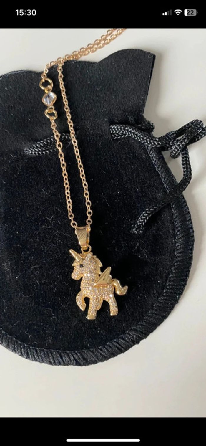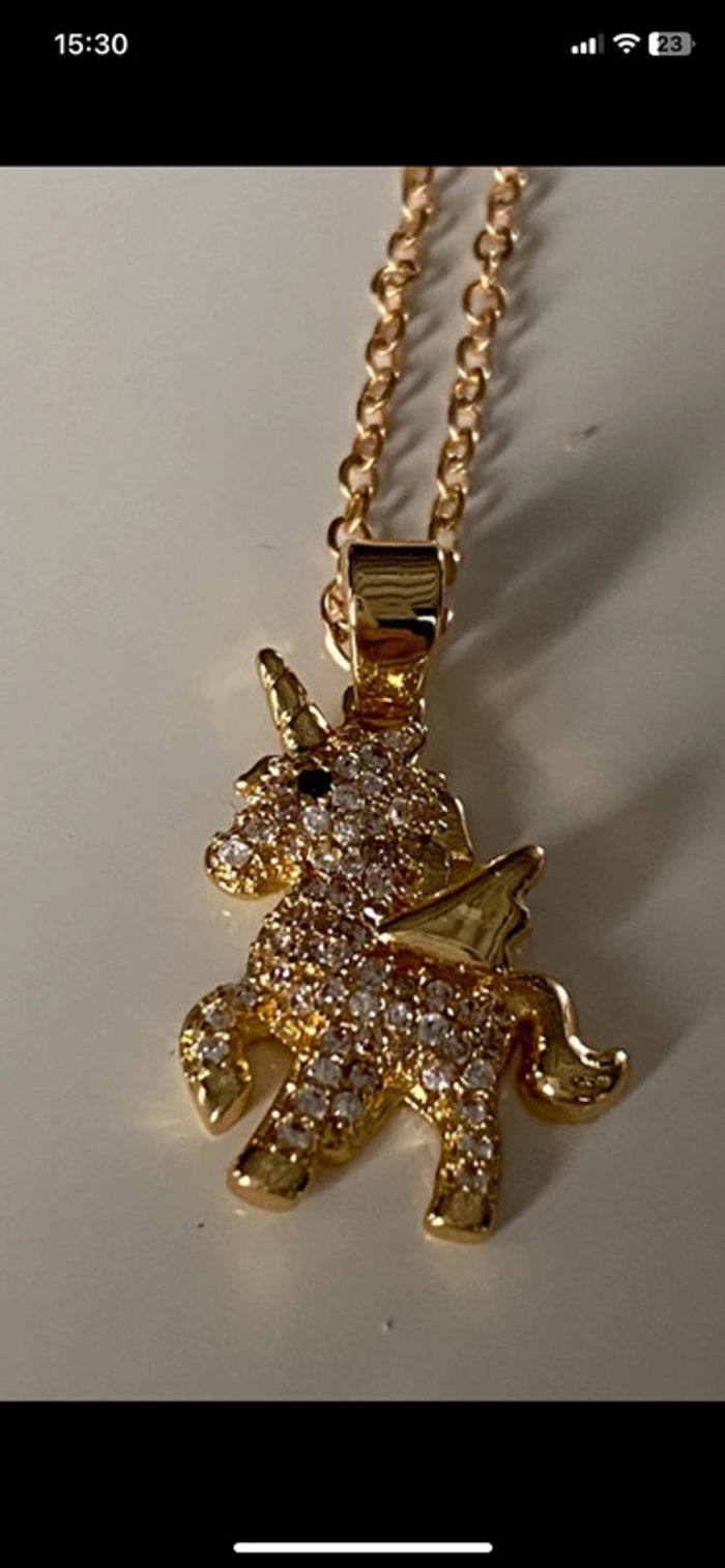 Ensemble neuf cadeau en doublon n’ayant pu être changé Chaîne avec un détail (strass brillant) Réglable entre 40 et 45 cms Pendentif licorne à strass Vendu avec pochon velours Idéal enfant #chaineetpendentif #licorne #bijouenfant #doré #strass #brillants #neuf #chantalmatejabijoux #chantalmatejachame #chantalmateja2025