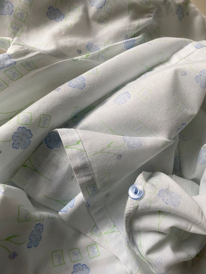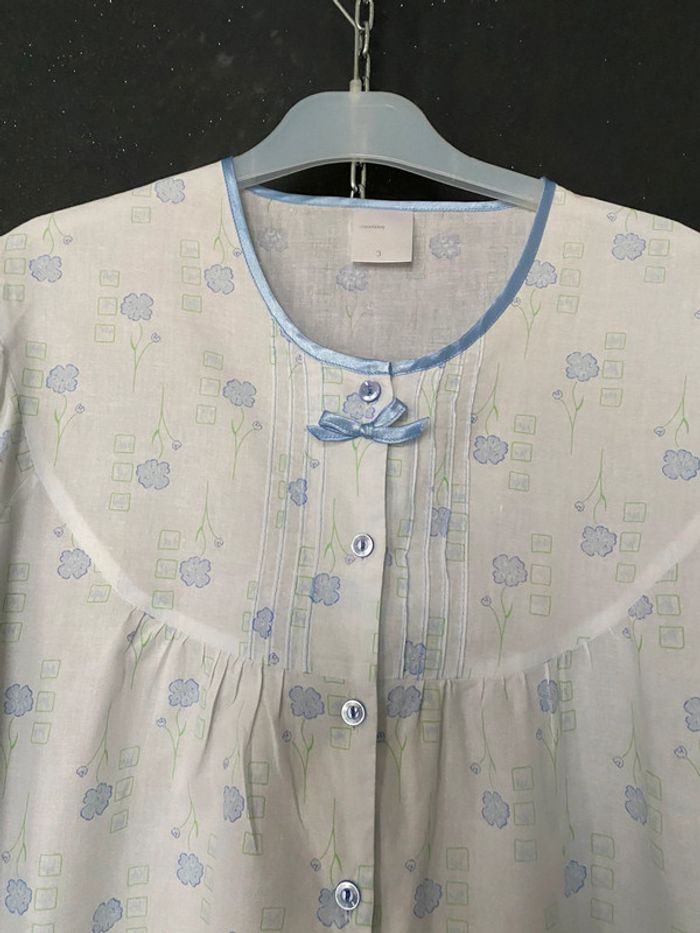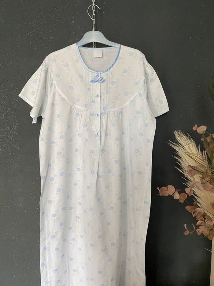 Prix ferme ! Chemise de nuit bleu ciel blanc Marque créations Fins plis et petit noeud Un petit bouton de rechange Pas d’étiquette semble en coton Taille 3 Epaules de couture à couture 42 Sous les aisselles 56 Longueur env 121 Article vintage #chemisedenuit #romantique #frais #cieletblanc #créations #vintage #chantalmatejachemisesdenuit #chantalmatejaval #chantalmateja2025