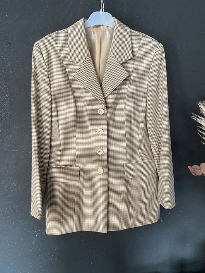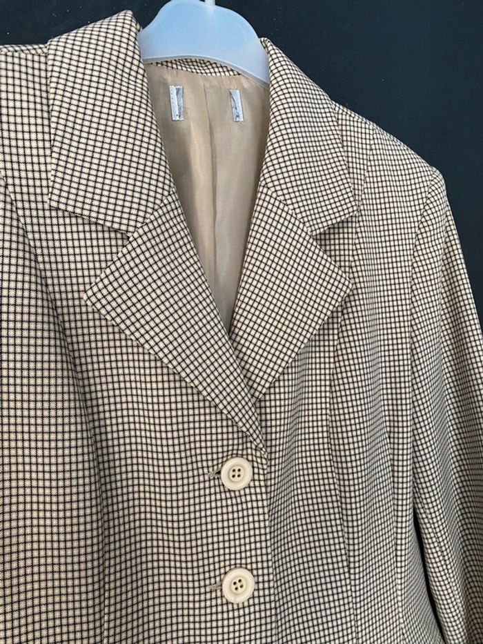 Blazer petits carreaux beige Polyester et viscose Doublé Légèrement épaulé Poches plaquées #blazer #vintage #petitscarreaux #beige #viscose #polyester #chantalmatejavestes38 #chantalmatejachame #chantalmateja2025