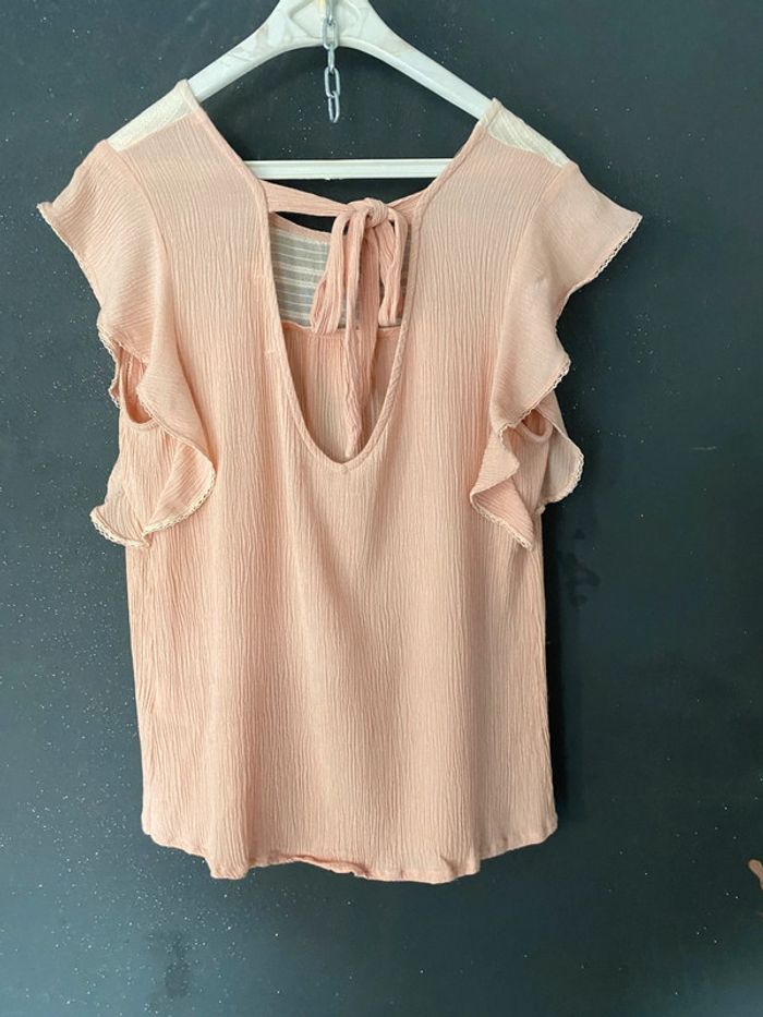 Top blouse romantique avec son plastron travaillé Matière polyester et coton aspect crepon Non porté Petits volants #top #blouse #vieuxroseetivoire #andyetlucy #nonporté #neuf #chic #romantique #chantalmatejahauts36 #chantalmatejaval #chantalmateja2025