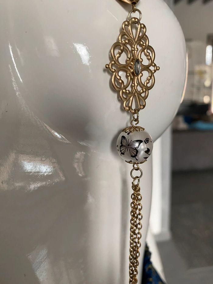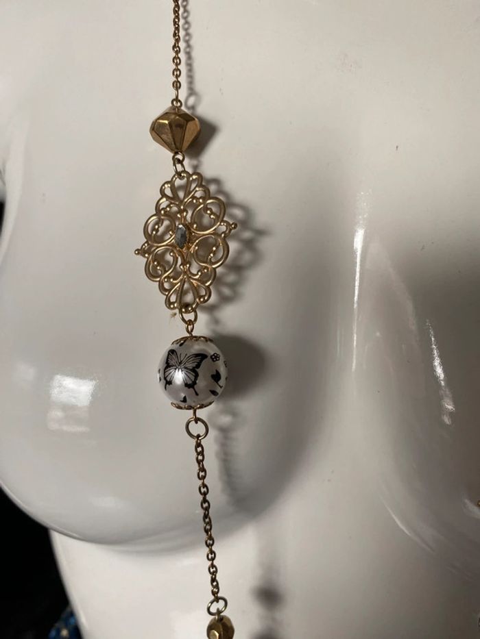 Collier sautoir rétro baroque vintage Un papillon dessiné sur les boules La chaîne en principe doré a une partie plutôt argenté Longueur à plat 52 cms #colliersautoir #baroque #retro #vintage #athypique #chantalmatejabijoux #chantalmatejamalo #chantalmateja2025
