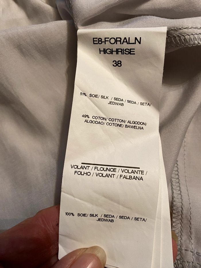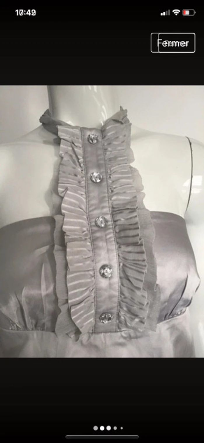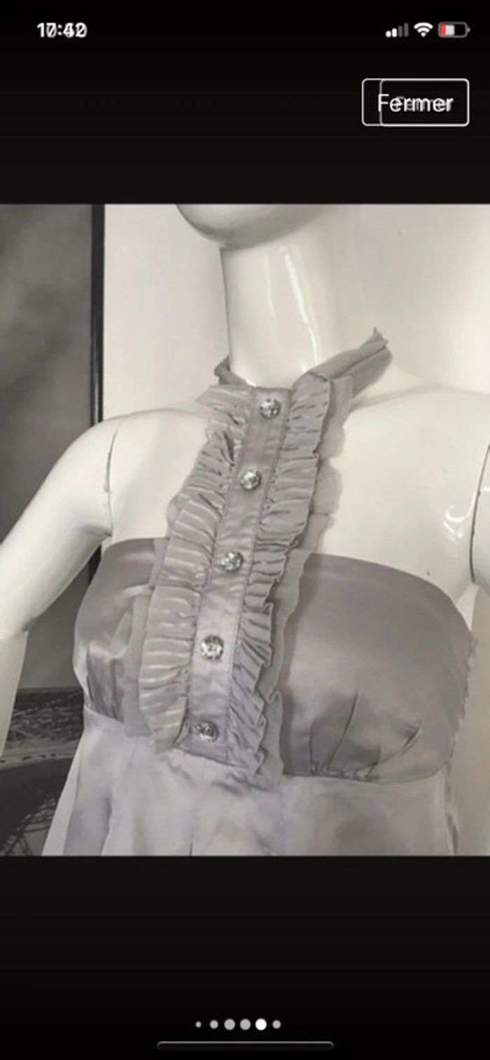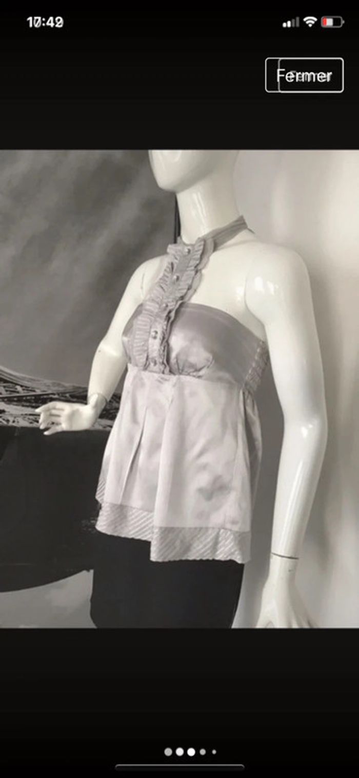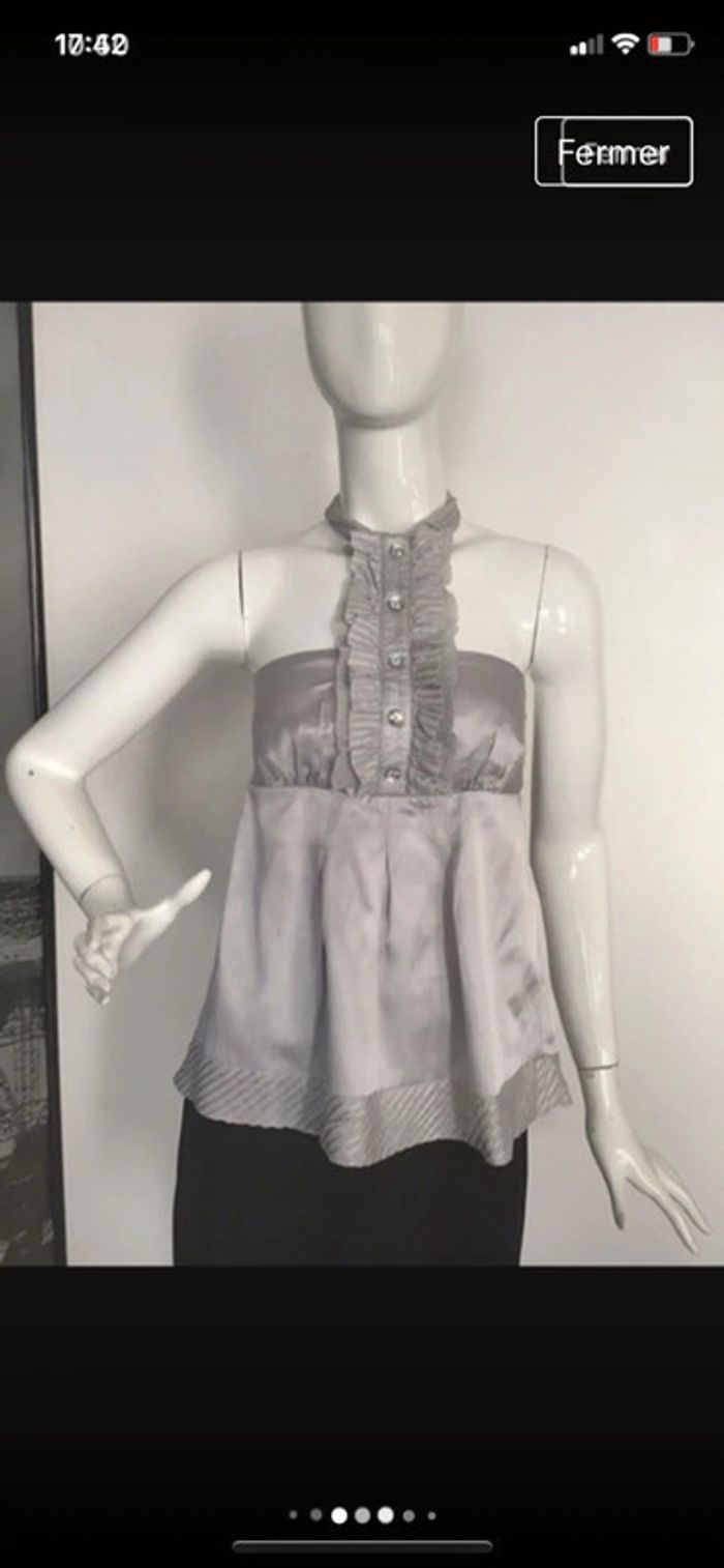 Top gris satiné à volants en soie À nouer derrière le cou (Matière satinée - soie et coton) Boutons décoratifs Bande élastique dans le dos #topdefete #topdesoirée #soie #morgan #tenuedefête #topépaulesdénudées #chantalmatejatenuedefete #chantalmatejamalo #chantalmateja2024