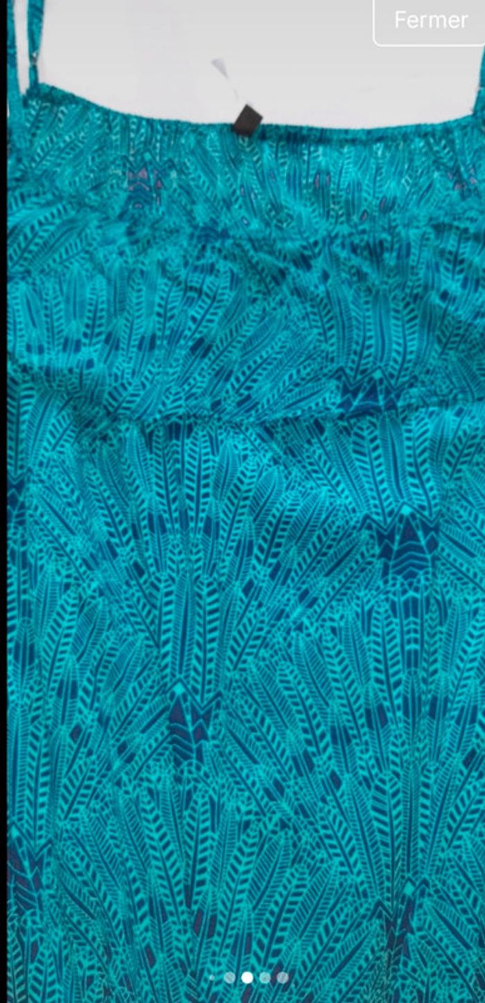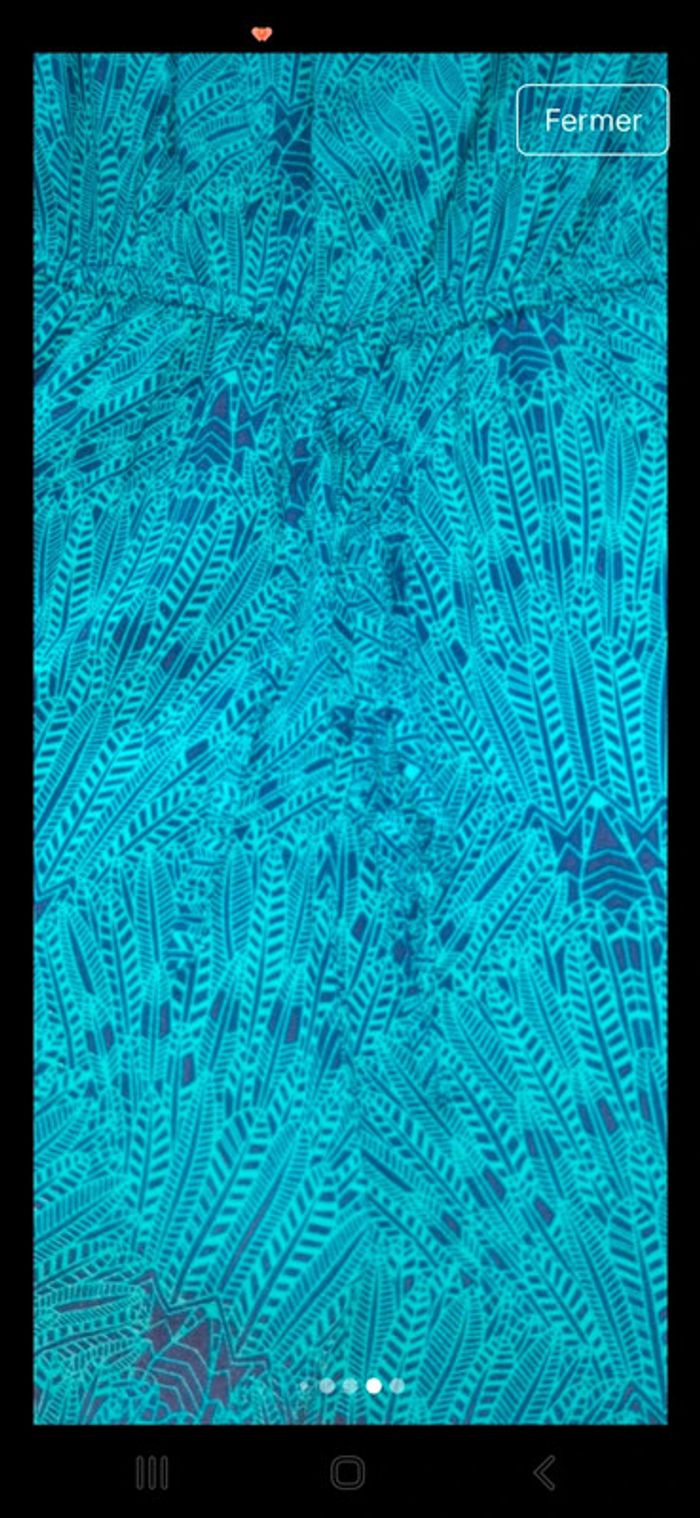 Superbe combishort à bretelles fines de couleur bleu turquoise, avec un imprimé ethnique graphique dans les tons bleu foncé. Taille élastiquée à la taille pour une coupe flatteuse. Matière légère et fluide en 100% viscose, parfaite pour les journées chaudes. #vanessavadfemme38 #combishort #été #taillem #bleuturquoise #ethnique #bohème #viscose #lookestival #vintedfrance