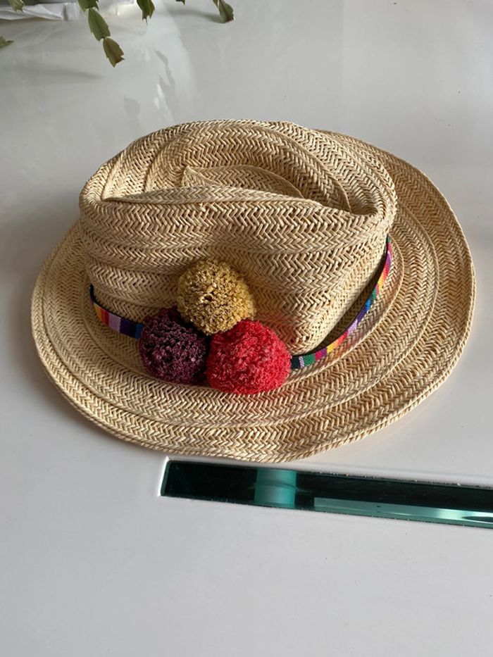 Chapeau de paille à pompons 51 cms #chapeaufille #tapealoeil #chapeaupaille #chapeau #chantalmatejamalo #chantalmatejachapeauxcasquettesbonnets #chantalmateja2024