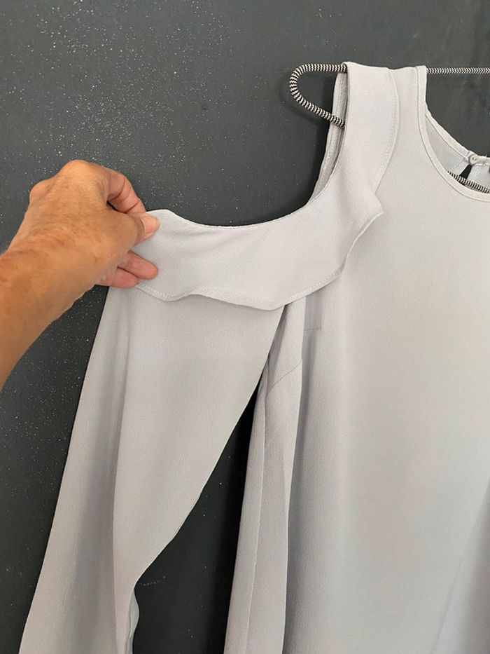Blouse gris perle (gris bleu) avec découpe aux épaules et volants Fermeture derrière par un petit bouton Polyester et 4% elasthane #blouse #top #epaulesnues #newlook #grisperle #grisbleu #chantalmatejahauts34 #chantalmatejamalo #chantalmateja2024