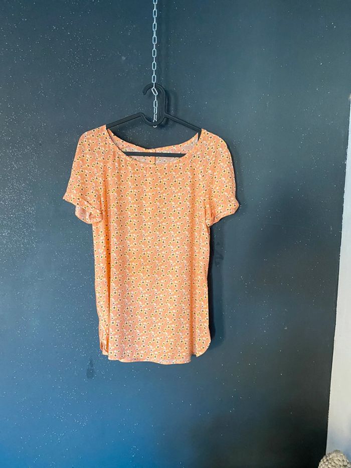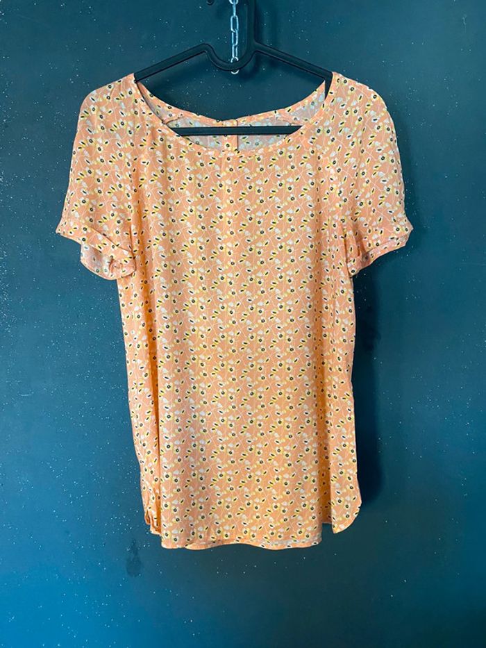 Blouse orangé imprimé petites fleurs Boutons derrière En viscose (légère et douce) #top #blouse #promod #orangé #chantalmatejahauts36 #chantalmatejamalo #chantalmateja2024